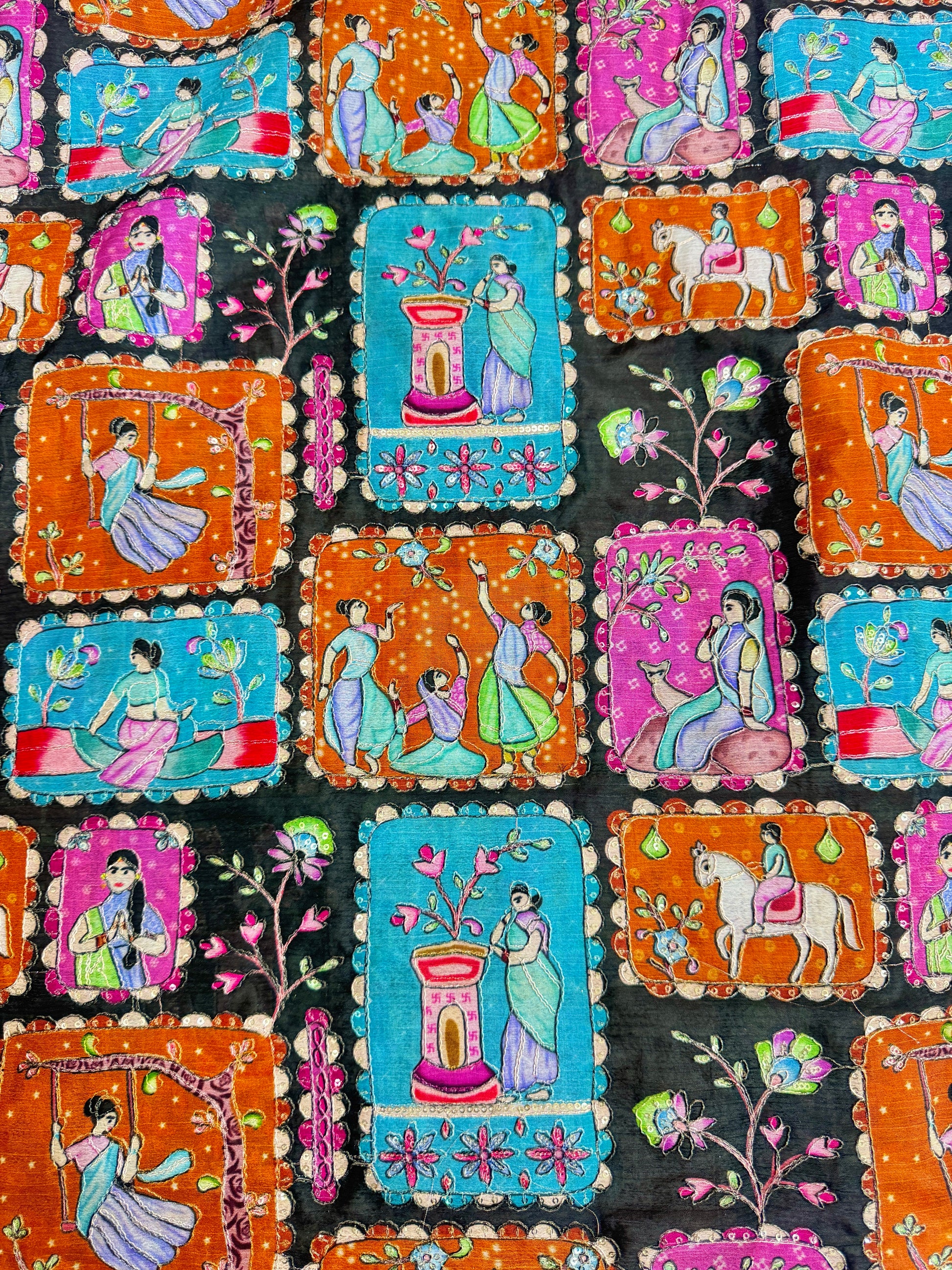 أضف لمسة ملكية إلى إبداعاتك مع قماش بانا 44 من الشانون الخالص، والذي يتميز بطبعة راجا-راني رائعة. يعرض هذا القماش نقوشًا تقليدية معقدة وملونة، بما في ذلك الأزواج الملكيين والفيلة وأنماط الأزهار، وكلها مُثرية بشكل جميل بالخيوط الدقيقة وزري. يوفر قوام الشانون الناعم ملمسًا ناعمًا ودrape أنيق، مما يجعله مثاليًا للساري والكورتي والليانغا والدوباتا وحتى مشاريع ديكور المنزل.