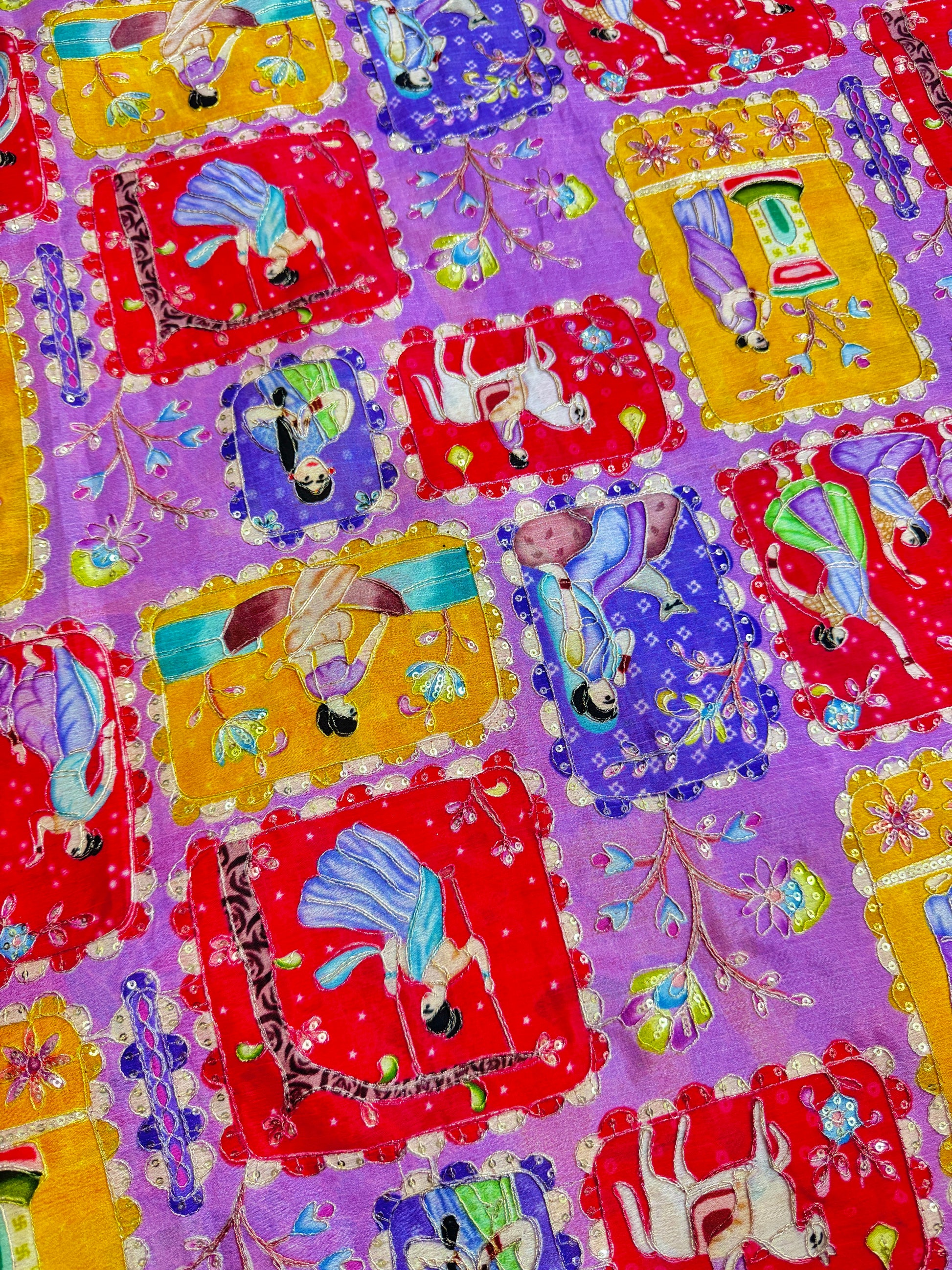 Ajoutez une touche royale à vos créations avec le tissu Panna 44 Pure Chenon, orné d'un exquis imprimé représentant un Raja et une Rani. Ce tissu présente des motifs traditionnels complexes et colorés, notamment des couples royaux, des éléphants et des motifs floraux, le tout magnifiquement enrichi de broderies au fil et au zari. Sa texture douce et fluide offre un toucher agréable et un tombé gracieux, ce qui le rend parfait pour les saris, les kurtis, les lehengas, les dupattas et même les projets de décoration intérieure.