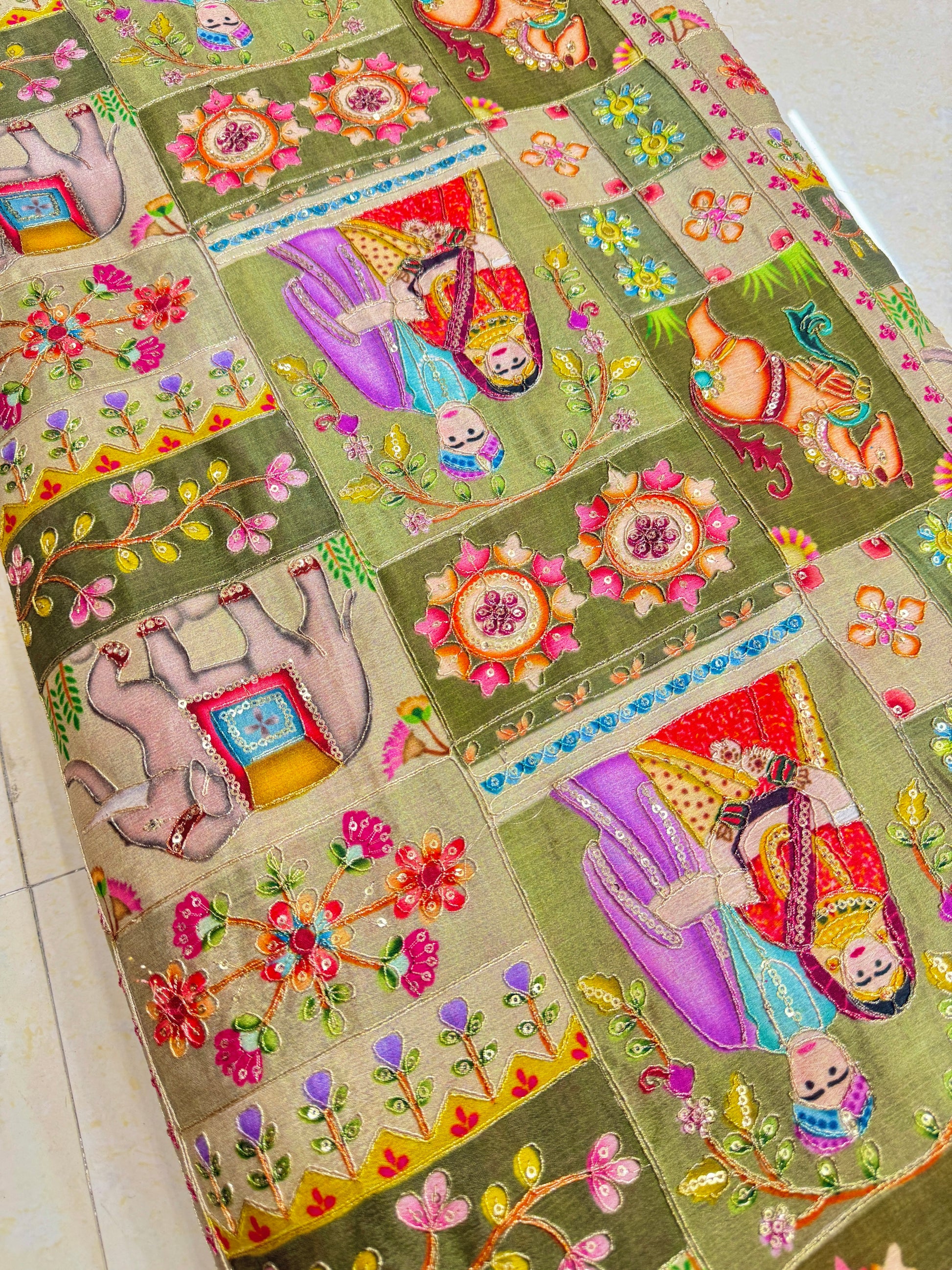 Ajoutez une touche royale à vos créations avec le tissu Panna 44 Pure Chenon, arborant un exquis imprimé représentant un Raja et une Rani. Ce tissu présente des motifs traditionnels complexes et colorés, notamment des couples royaux, des éléphants et des motifs floraux, le tout magnifiquement enrichi de broderies au fil et au zari. Sa texture douce et fluide offre un toucher agréable et un drapé gracieux, ce qui le rend parfait pour les sarees, les kurtis, les lehengas, les dupattas et même les projets de décoration intérieure.