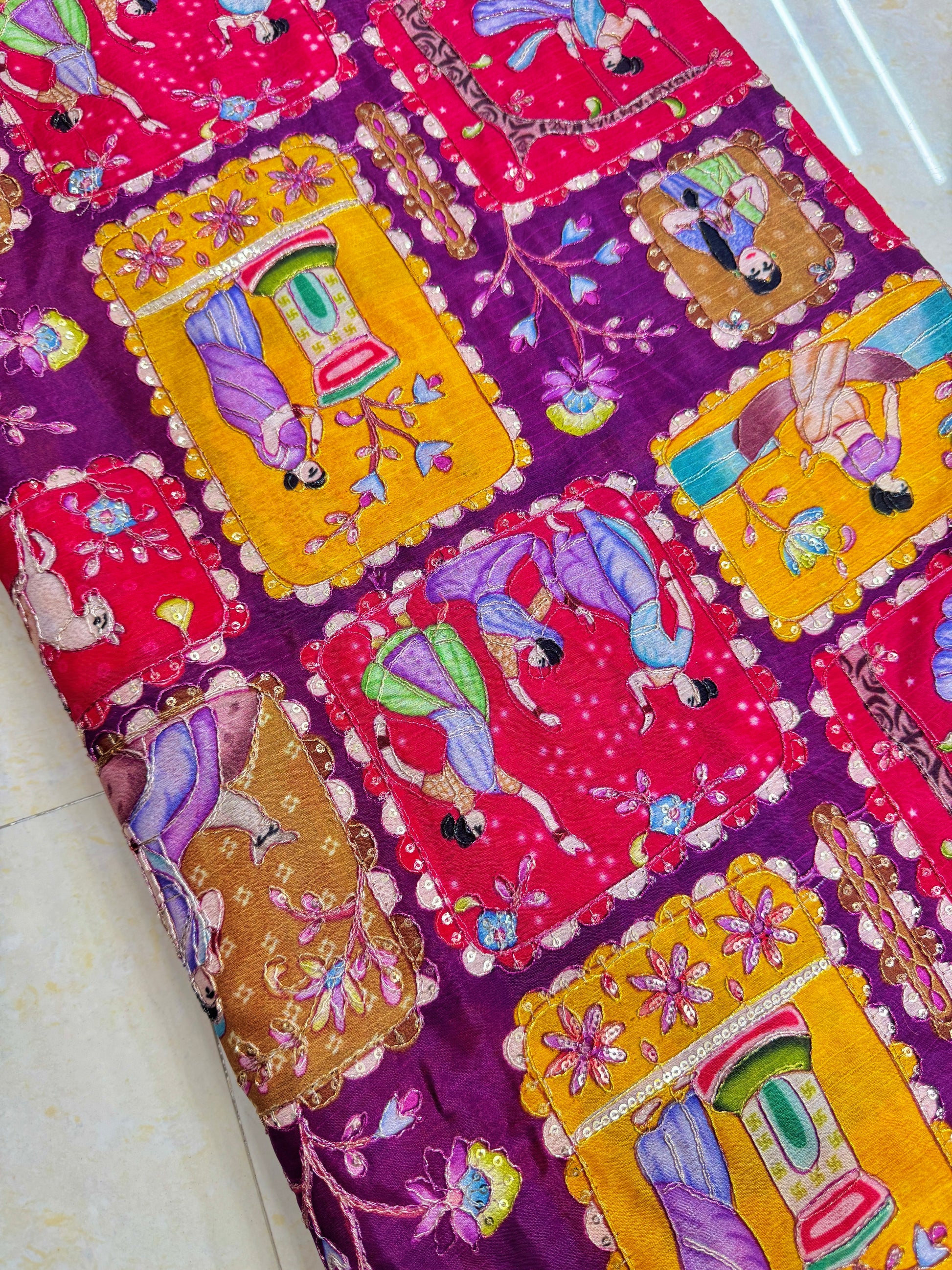 Ajoutez une touche royale à vos créations avec le tissu Panna 44 Pure Chenon, orné d'un exquis imprimé représentant un Raja et une Rani. Ce tissu présente des motifs traditionnels complexes et colorés, notamment des couples royaux, des éléphants et des motifs floraux, le tout magnifiquement enrichi de broderies au fil et au zari. Sa texture douce et fluide offre un toucher agréable et un tombé gracieux, ce qui le rend parfait pour les saris, les kurtis, les lehengas, les dupattas et même les projets de décoration intérieure.