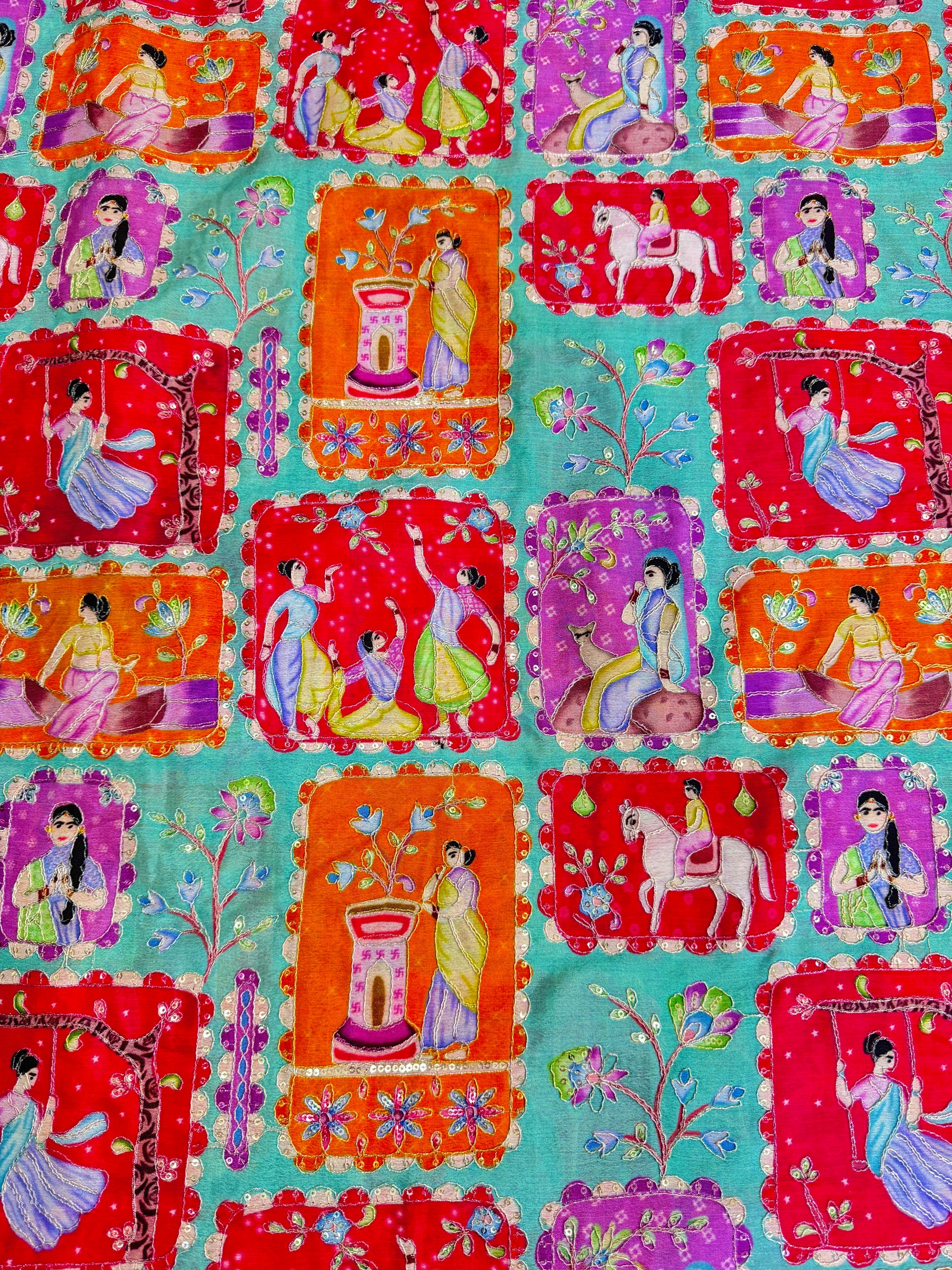 Ajoutez une touche royale à vos créations avec le tissu Panna 44 Pure Chenon, arborant un exquis imprimé représentant un Raja et une Rani. Ce tissu présente des motifs traditionnels complexes et colorés, notamment des couples royaux, des éléphants et des motifs floraux, le tout magnifiquement enrichi de broderies au fil et au zari. Sa texture douce et fluide offre un toucher agréable et un drapé gracieux, ce qui le rend parfait pour les sarees, les kurtis, les lehengas, les dupattas et même les projets de décoration intérieure.