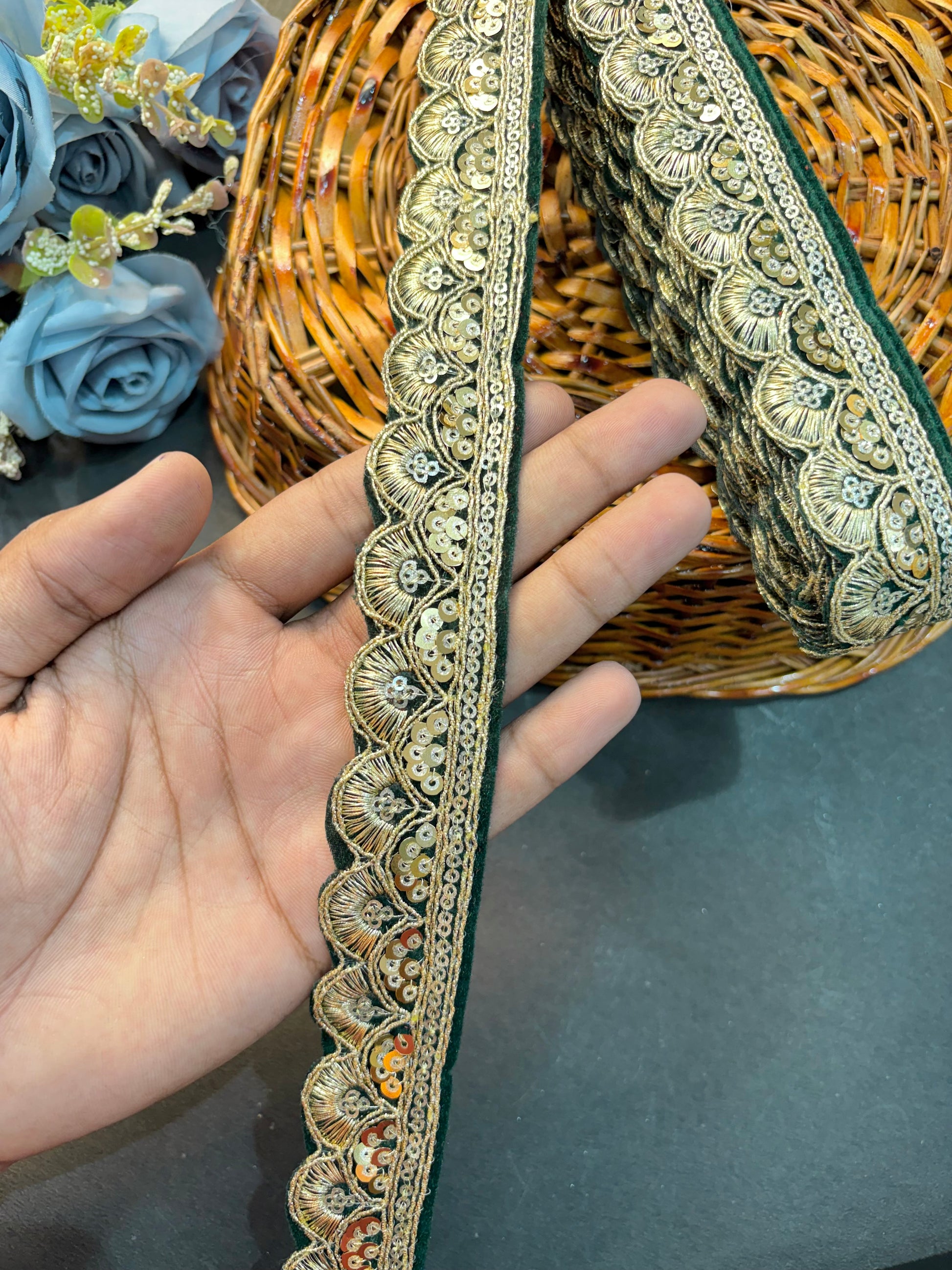 Elevate your formal and festive outfits with this exquisite Velvet Golden Zari Embroidery Scallop Lace Border. This designer trim features a rich Velvet base (available in multiple colors, e.g., Black, Red, Green), embellished with shimmering Golden Zari threadwork and subtle Sequins. The defining scalloped edge adds a sophisticated, ready-made finish to your sarees, lehengas, and dupattas.
