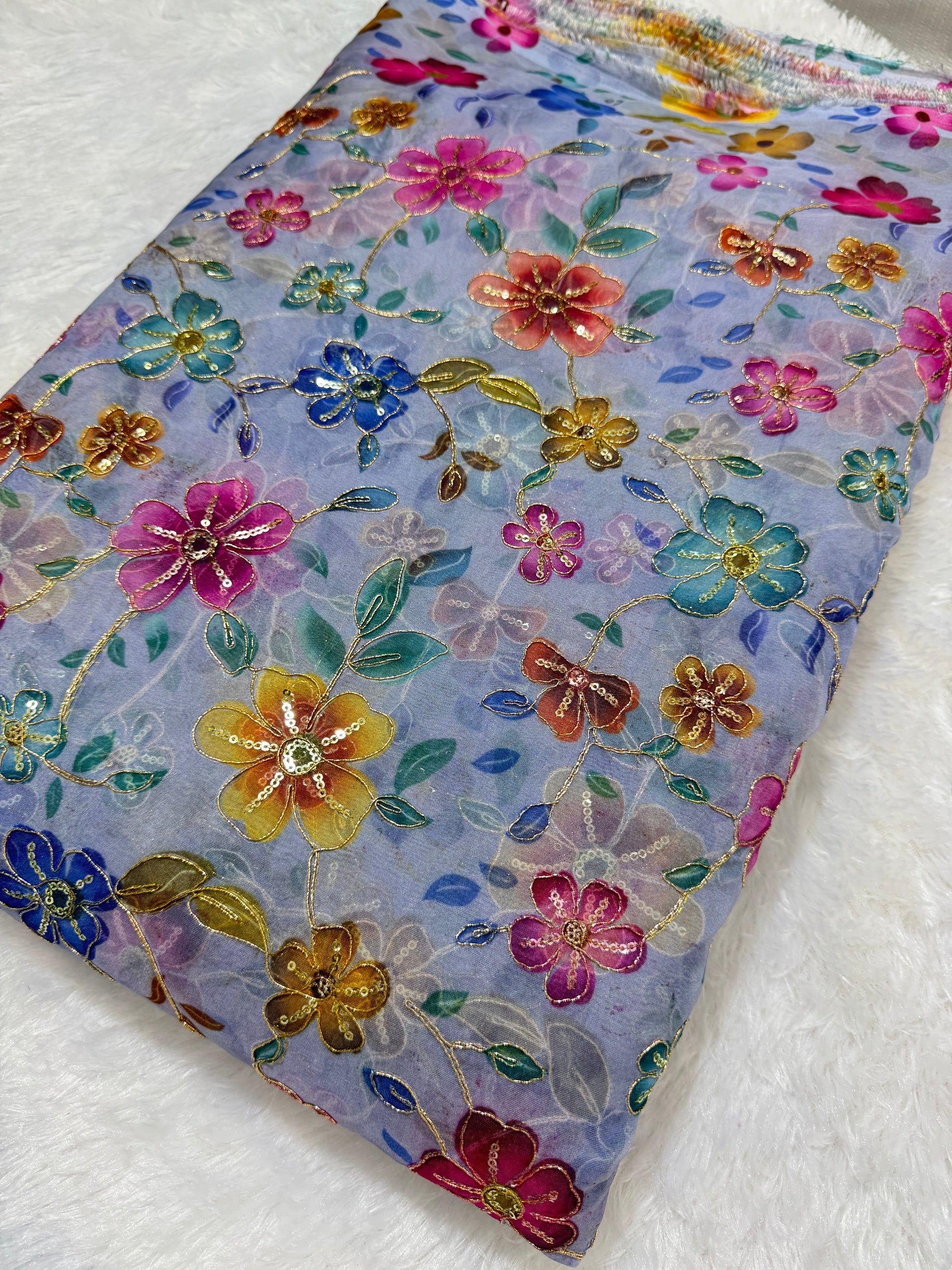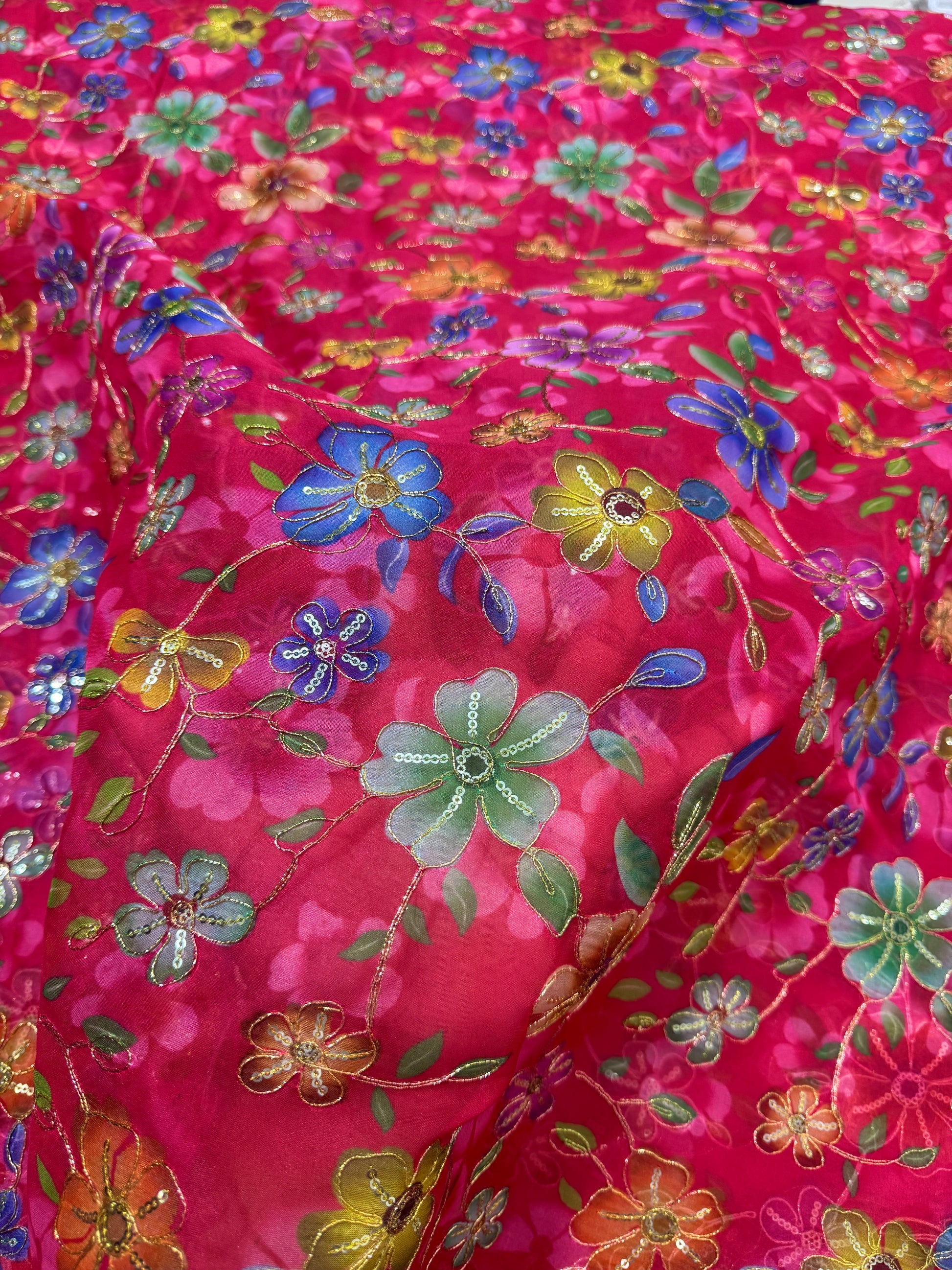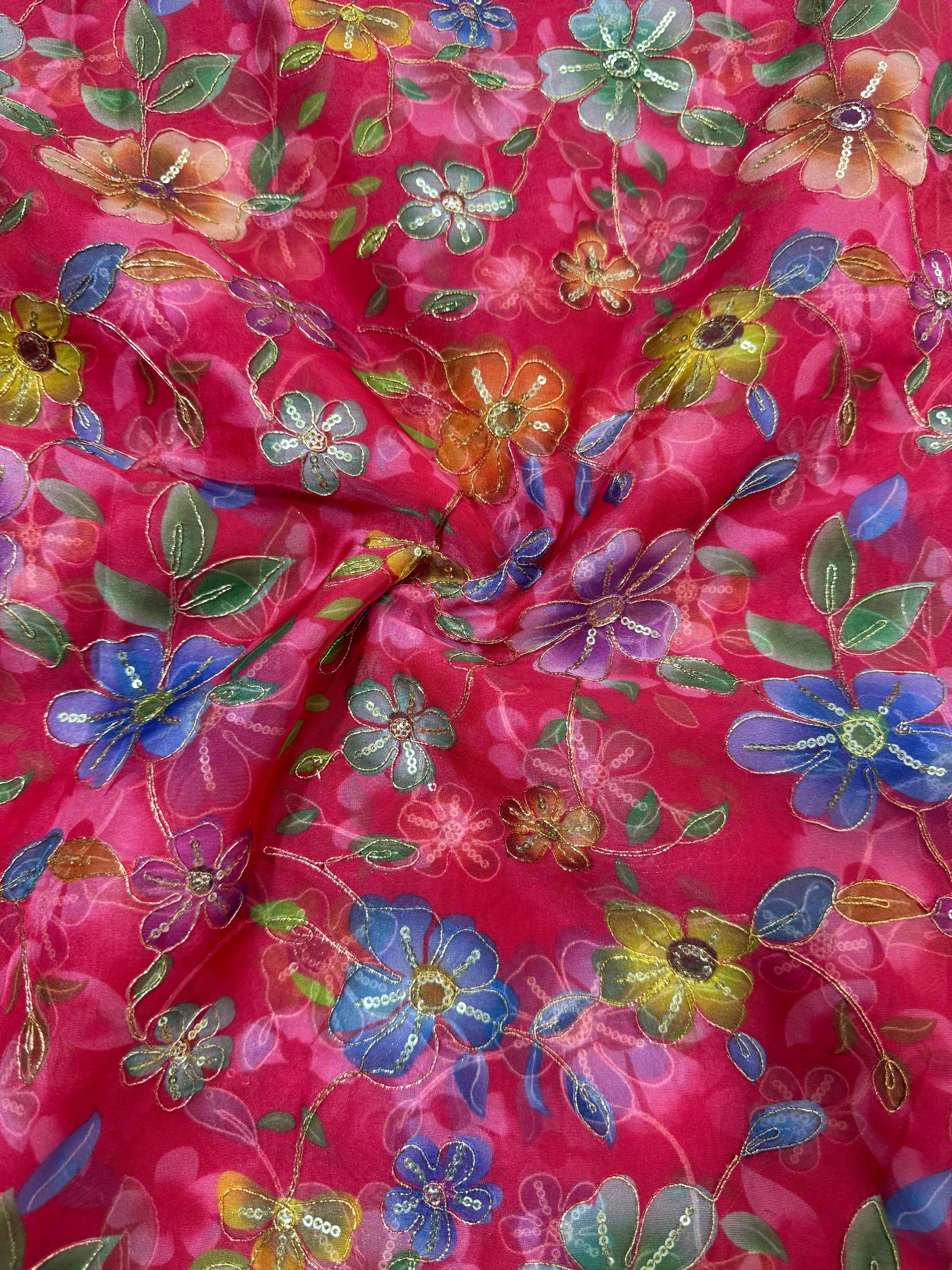 Add a touch of sophistication to your wardrobe with this Premium Taffy Silk Zari Work Fabric featuring multicolor floral embroidery. With its wide 44–45 inch width, this luxurious fabric is the perfect choice for designing elegant gowns, sarees, lehengas, and other statement ethnic or contemporary outfits.