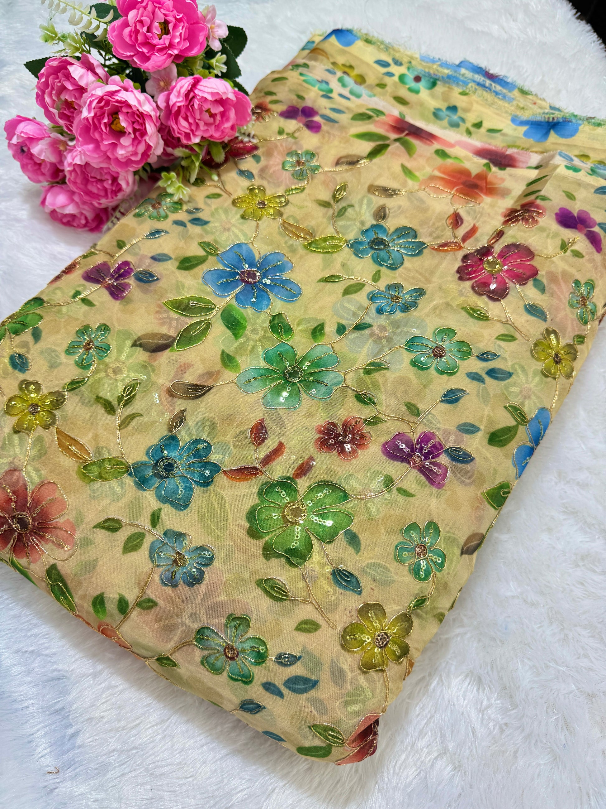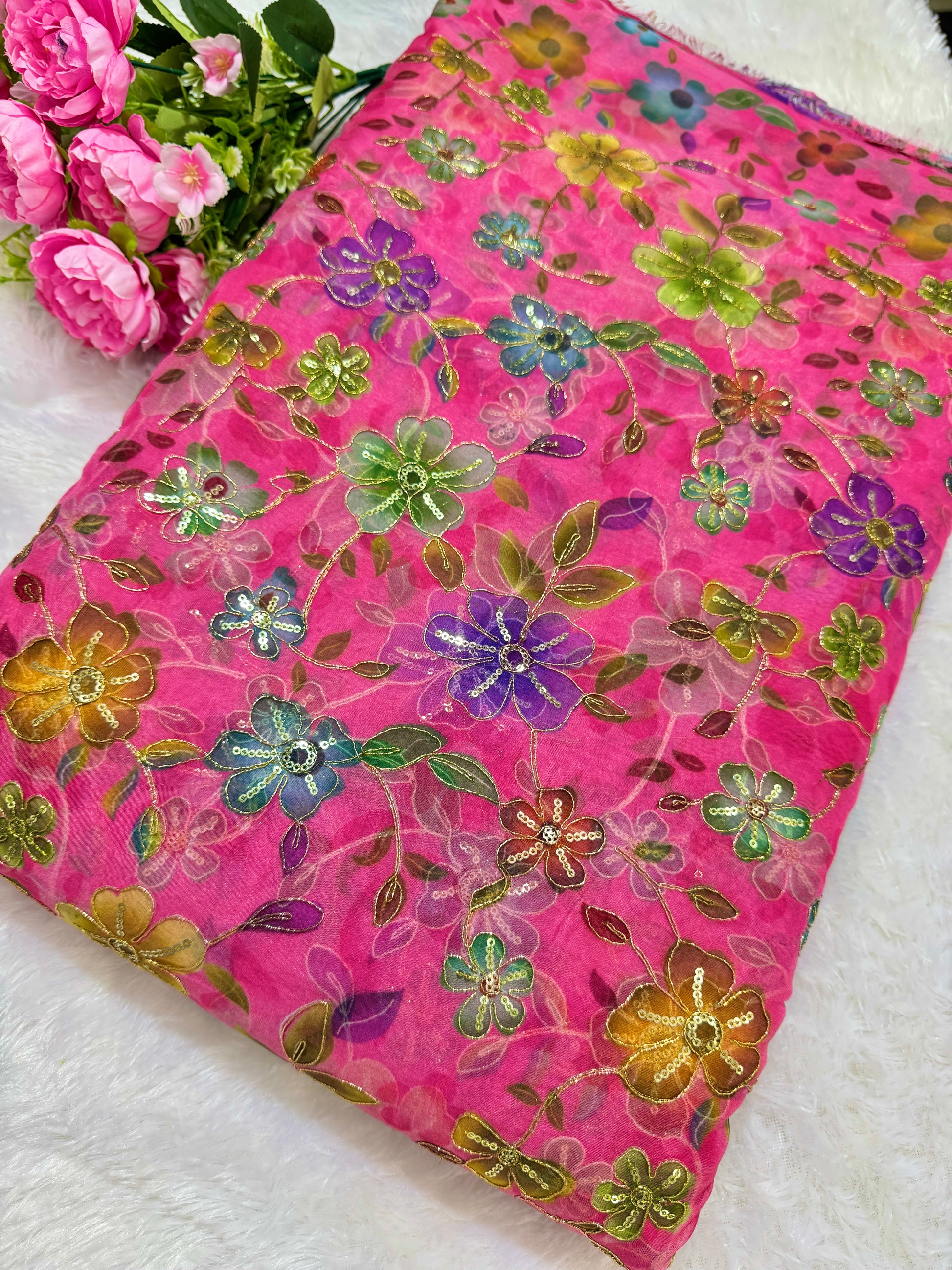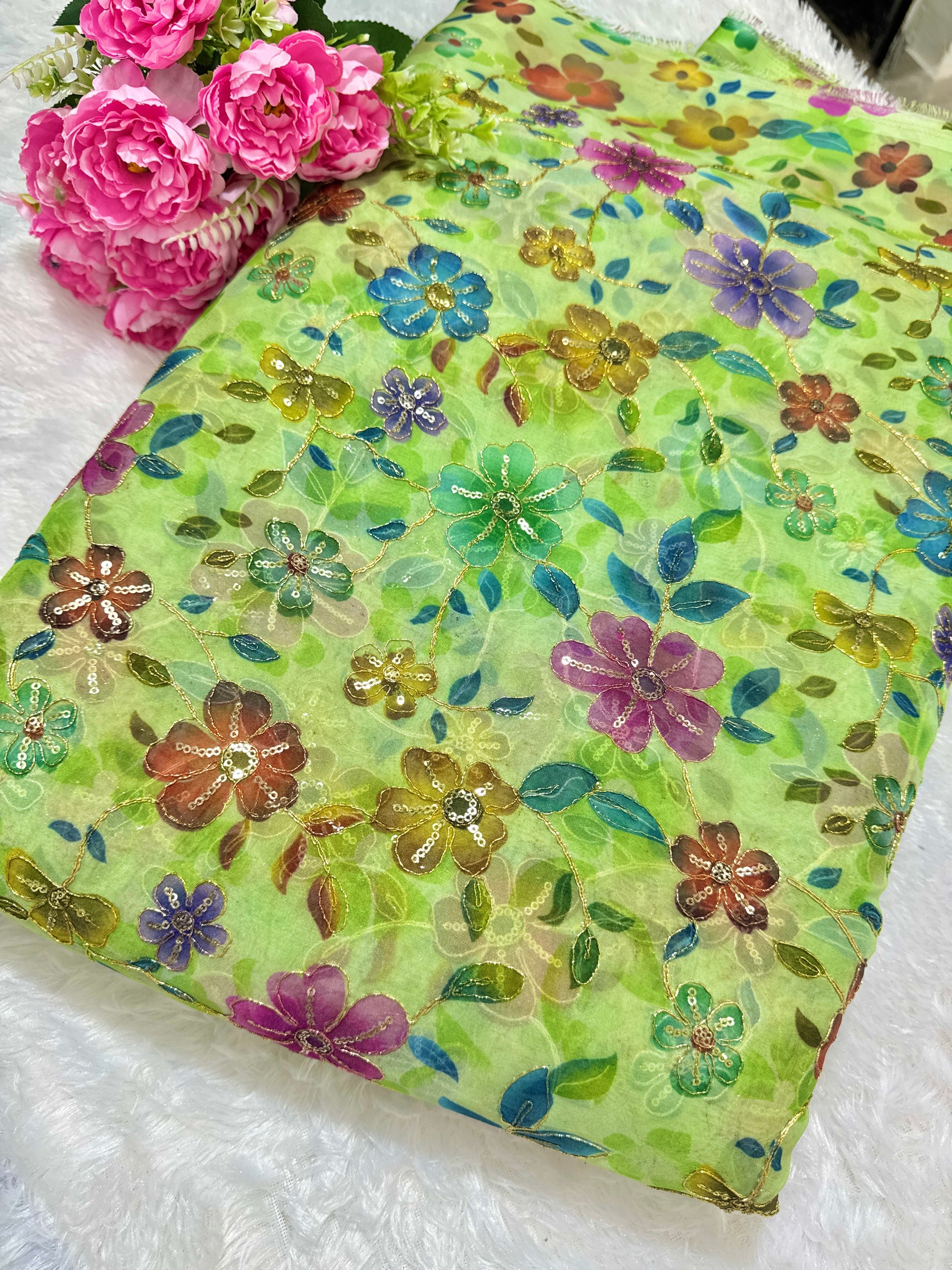 Add a touch of sophistication to your wardrobe with this Premium Taffy Silk Zari Work Fabric featuring multicolor floral embroidery. With its wide 44–45 inch width, this luxurious fabric is the perfect choice for designing elegant gowns, sarees, lehengas, and other statement ethnic or contemporary outfits.
