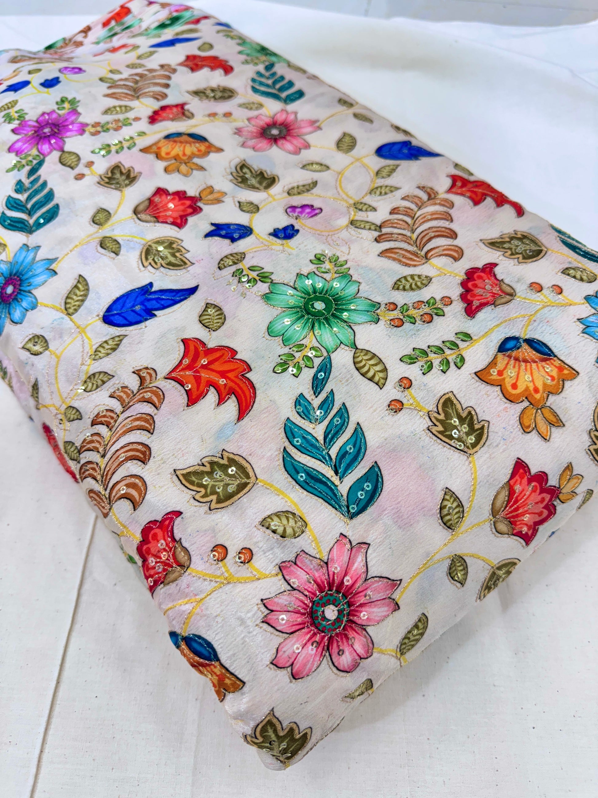 Add a touch of timeless elegance to your collection with this MULTI colour silk blend fabric, beautifully adorned with a vibrant multicolor floral print. The rich hues of red, blue, green, pink, orange, and gold accents create a striking contrast against the subtle off-white base, making it a perfect choice for festive and everyday ethnic wear.