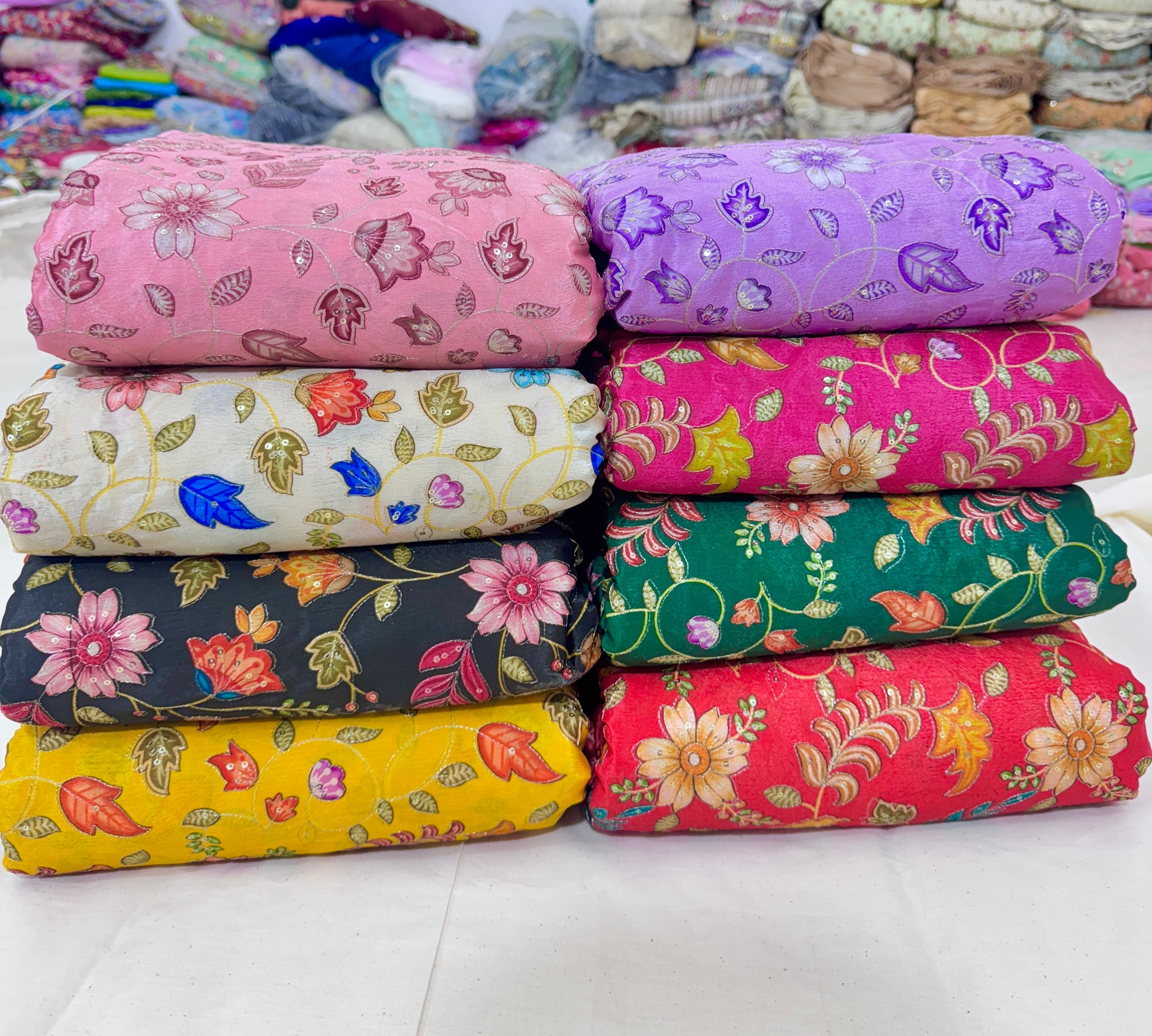 Add a touch of timeless elegance to your collection with this MULTI colour silk blend fabric, beautifully adorned with a vibrant multicolor floral print. The rich hues of red, blue, green, pink, orange, and gold accents create a striking contrast against the subtle off-white base, making it a perfect choice for festive and everyday ethnic wear.