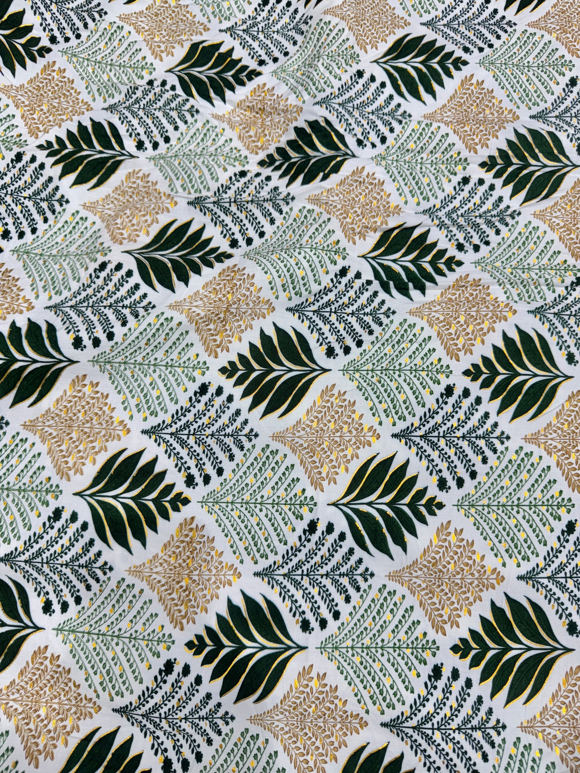 Bring a fresh and elegant touch to your creations with this beautiful print fabric. Designed with an and highlighted with white and golden leaf patterns, this fabric adds a natural yet stylish vibe to any outfit or décor. The soft, breathable material makes it perfect for dresses, kurtis, shirts, skirts, blouses, and home décor projects like curtains and cushion covers.• Fabric Type: printed rayon Lightweight, breathable, and smooth finish
