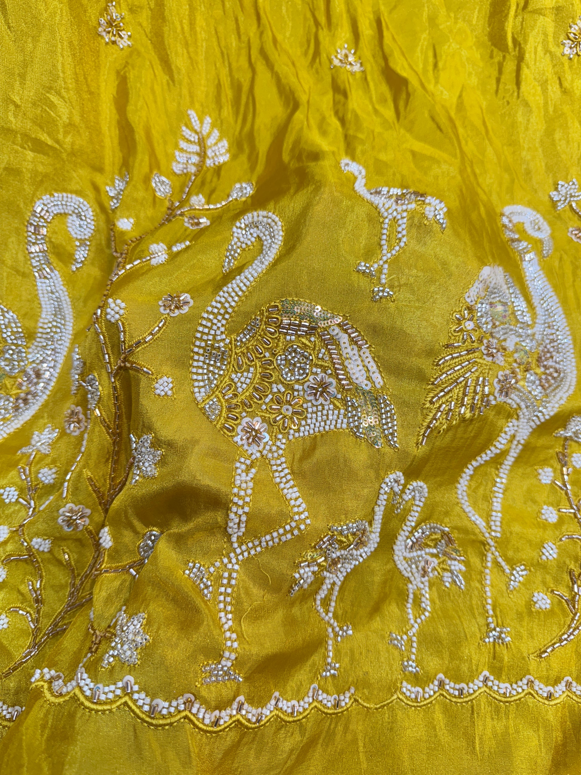 Elevate your ethnic and designer wear collections with this luxurious Viscose Tissue Fabric, exquisitely adorned with handwork with embroidery swan motifs and floral designs. The fabric features intricate zari, sequins, and beadwork embroidery that brings a rich, shimmering effect, perfect for festive and bridal ensembles.