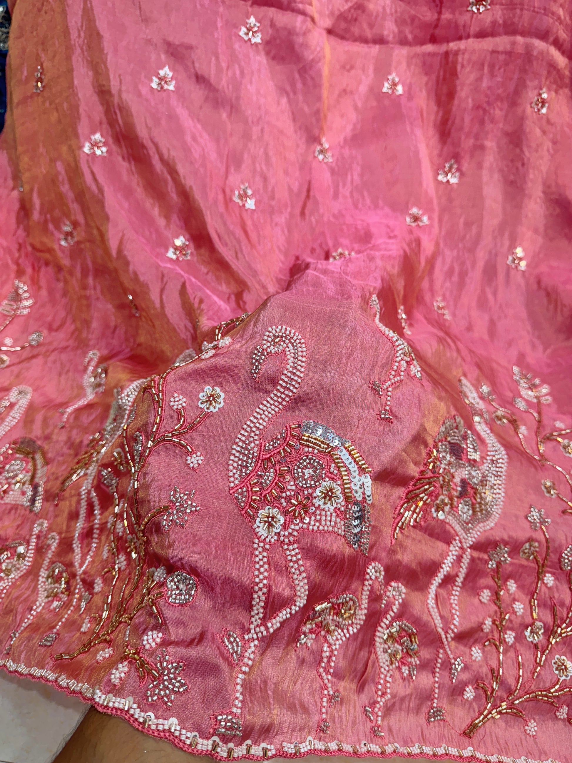 Elevate your ethnic and designer wear collections with this luxurious Viscose Tissue Fabric, exquisitely adorned with handwork with embroidery swan motifs and floral designs. The fabric features intricate zari, sequins, and beadwork embroidery that brings a rich, shimmering effect, perfect for festive and bridal ensembles.
