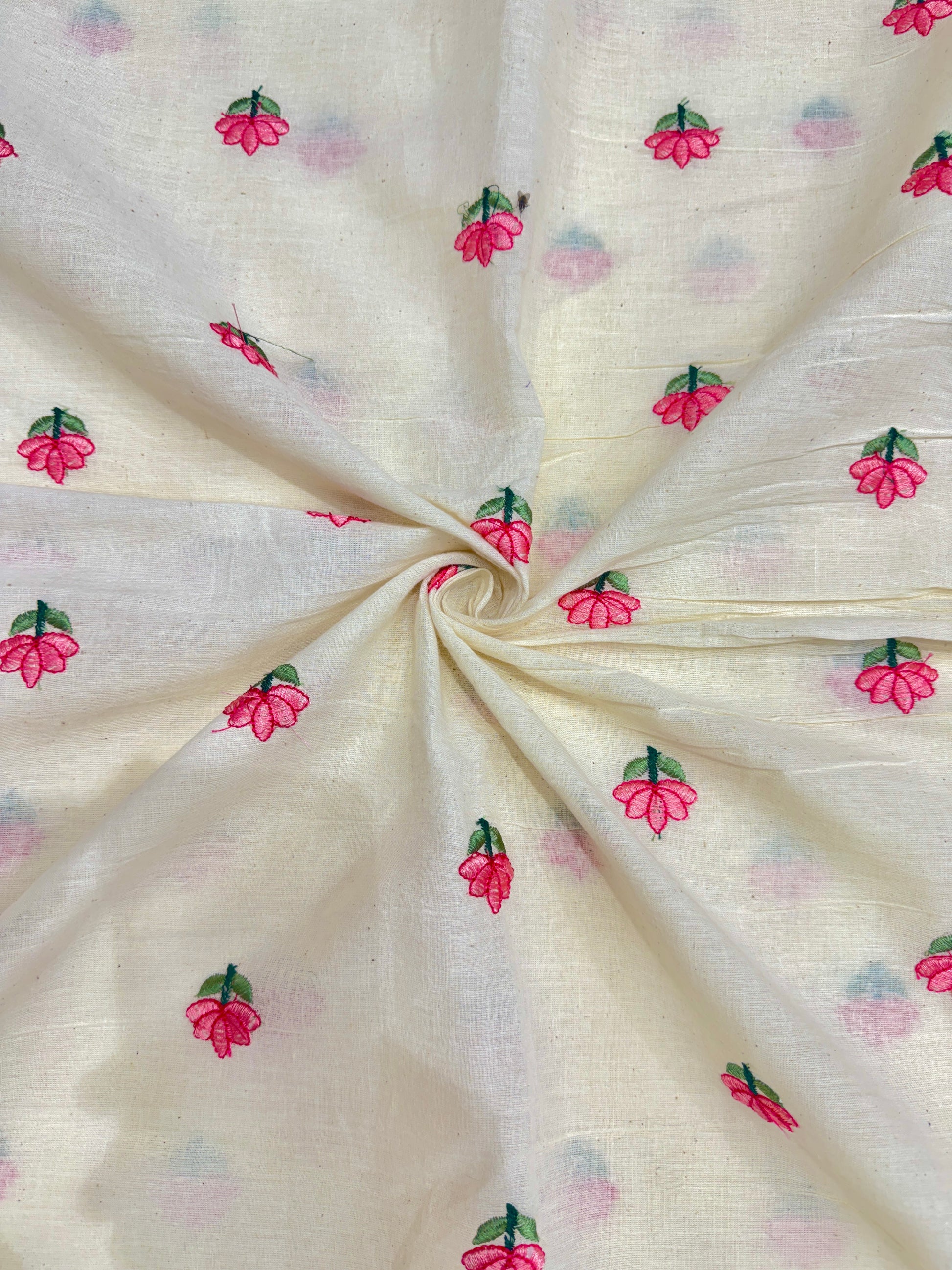 Add elegance to your collection with this off-white embroidered fabric featuring delicate floral motifs and green leaf accents. The lightweight fabric is soft, breathable, and perfect for creating stylish tops ,kurtis, sarees, blouses, dupattas, or home décor accents. Its minimal yet charming floral embroidery enhances the overall appeal, making it suitable for festive wear, ethnic outfits, and casual chic styleProduct Description: