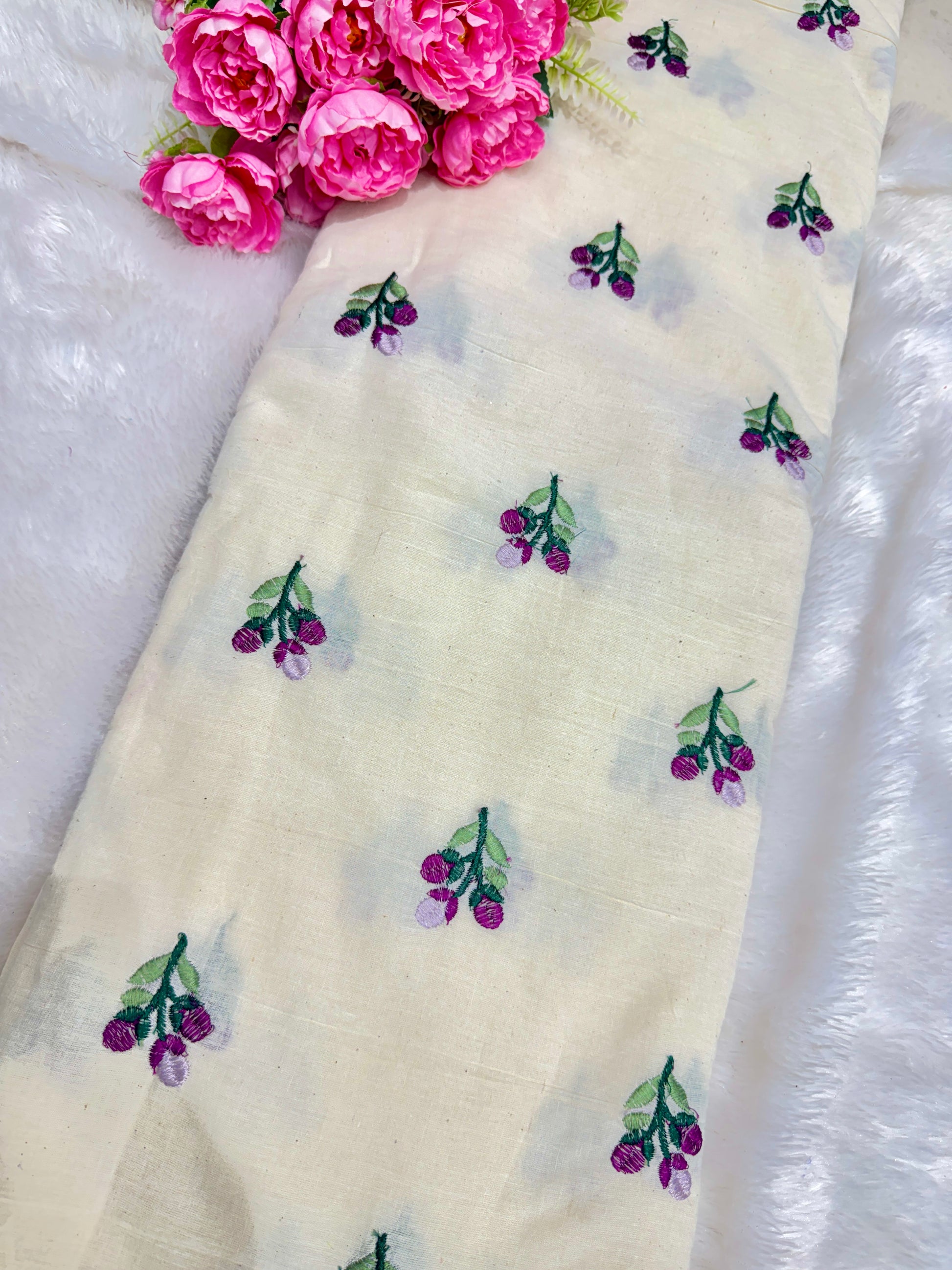Add elegance to your collection with this off-white embroidered fabric featuring delicate floral motifs and green leaf accents. The lightweight fabric is soft, breathable, and perfect for creating stylish tops ,kurtis, sarees, blouses, dupattas, or home décor accents. Its minimal yet charming floral embroidery enhances the overall appeal, making it suitable for festive wear, ethnic outfits, and casual chic styleProduct Description: