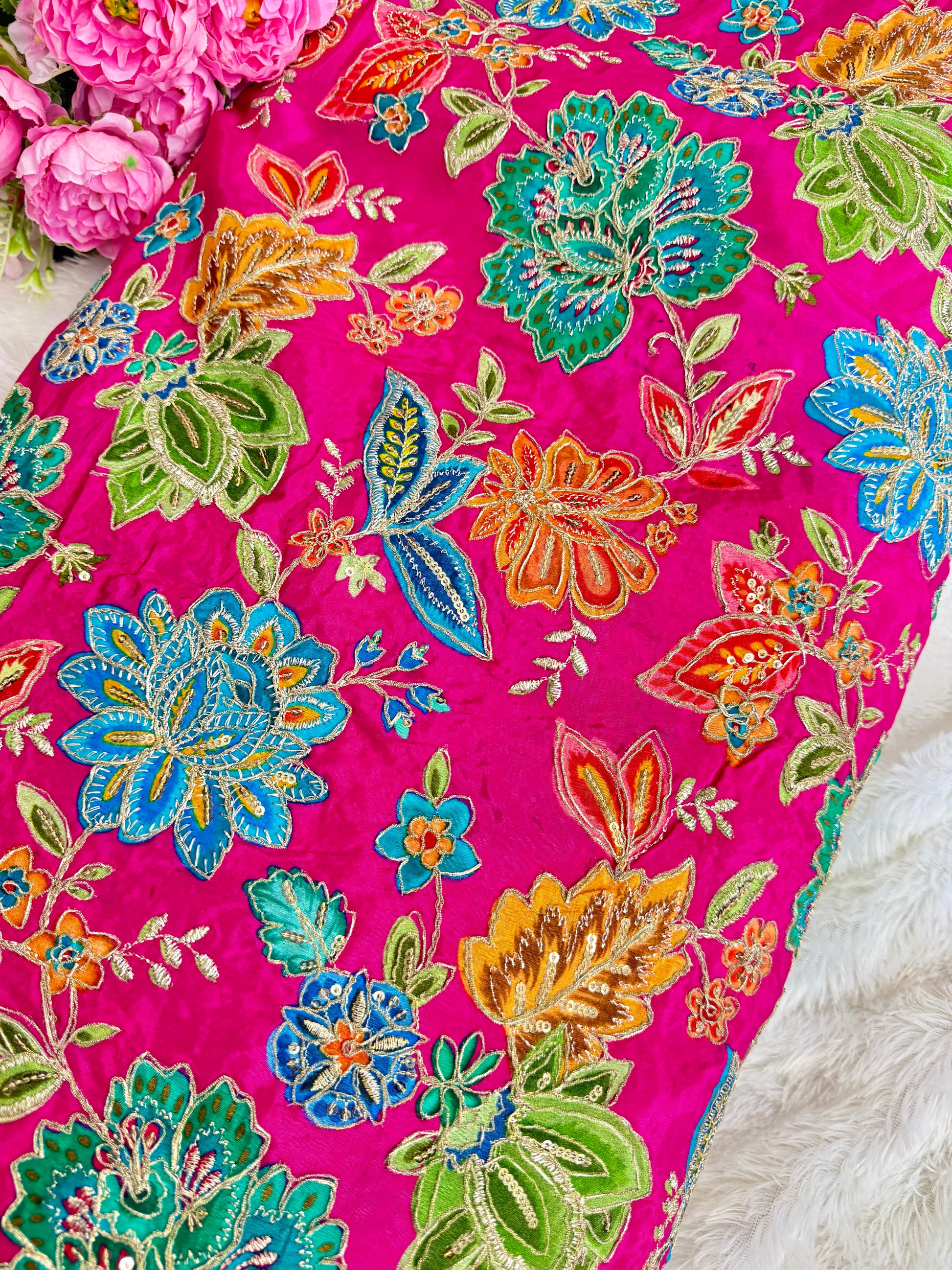 Unleash your inner fashionista with our Pure Viscose Crape Floral Print Embroidery . Made from pure viscose crape, this fabric features delicate details with cutdana and sequins for a touch of sparkle. Perfect for creating stunning sarees, suits, and gowns