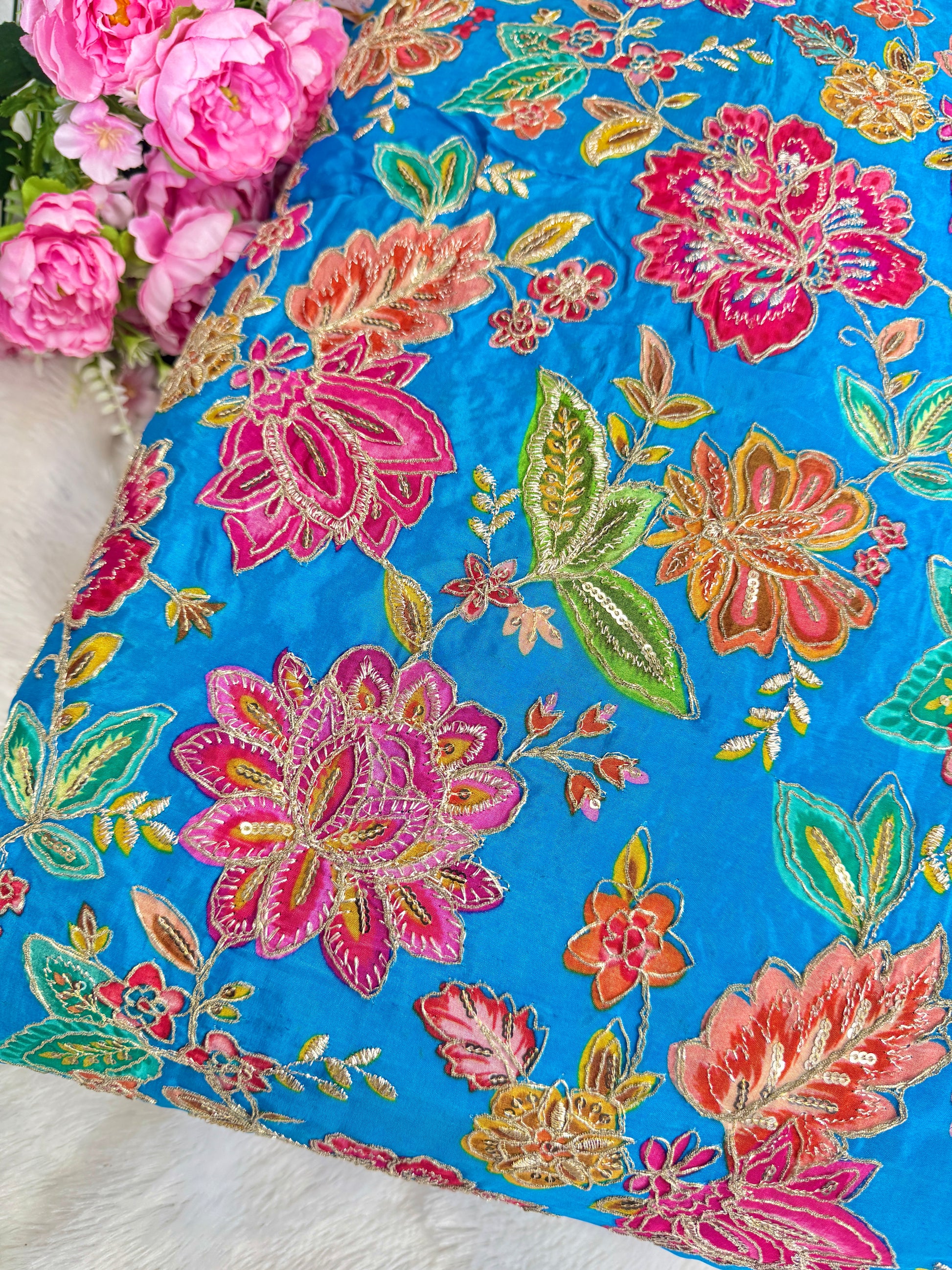 👗LUXURY NATURAL CRAPE FLORAL PRINT EMBROIDERY WITH SEQUINS 44 INCH WIDTH SKY BLUE