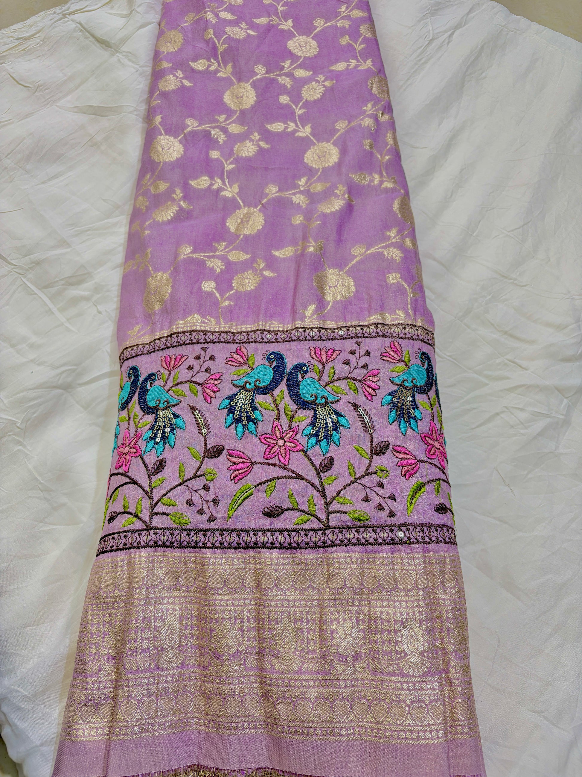 Enhance your ethnic wardrobe with this luxurious Banarasi Jacquard Silk Fabric featuring elegant zari floral weaving and a vibrant peacock embroidery border. Crafted with fine detailing and a smooth silk texture, this fabric is ideal for creating designer sarees, lehengas, dupattas, and ethnic gowns. Its rich pink tone with golden zari and multicolor peacock motifs gives a royal and festive look.