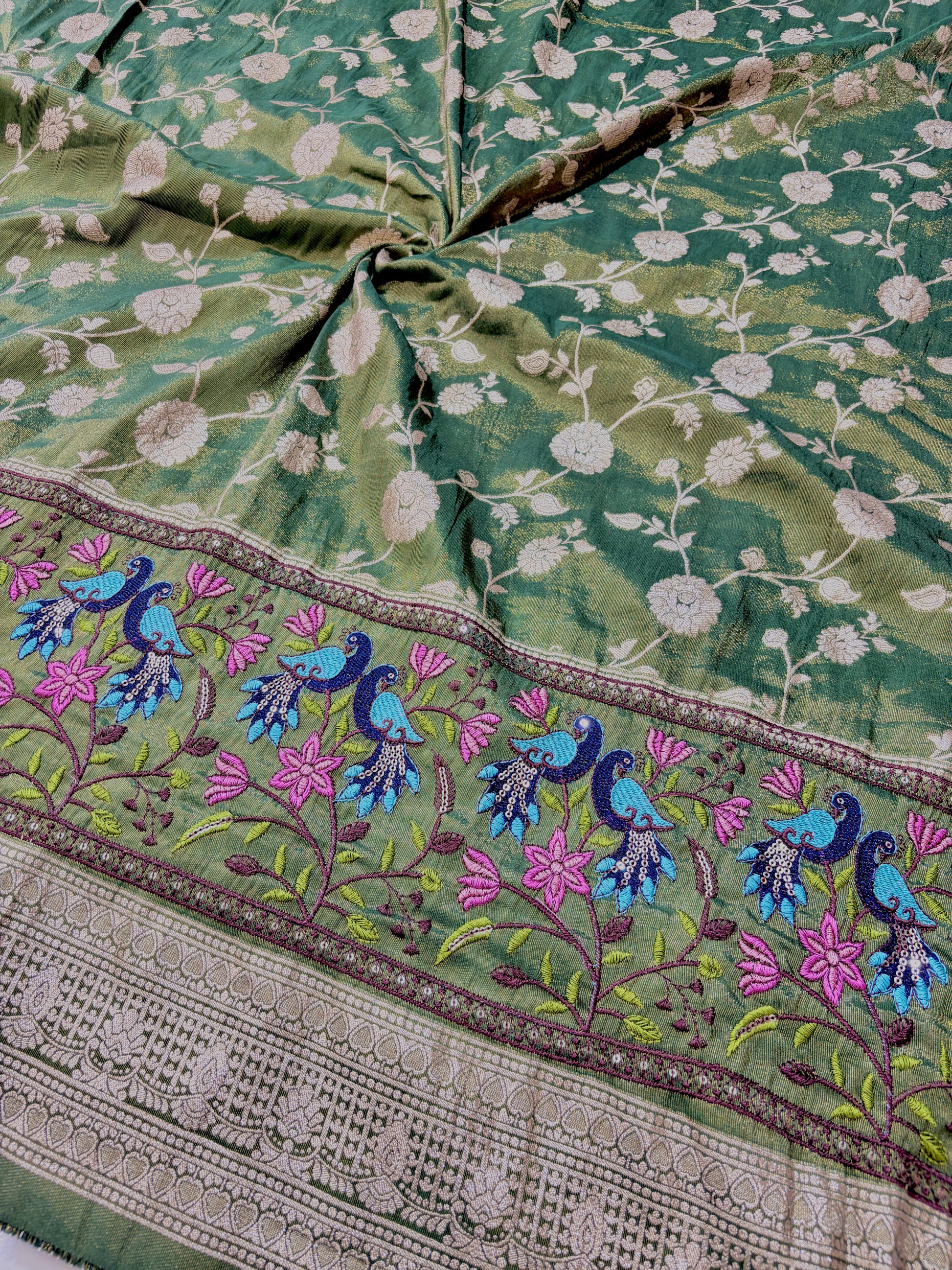 Banarasi Jacquard Silk Fabric with Peacock Embroidery Border | Floral Zari Design Fabric for Saree, Lehenga, Dupatta & Gown 44-45 width panna