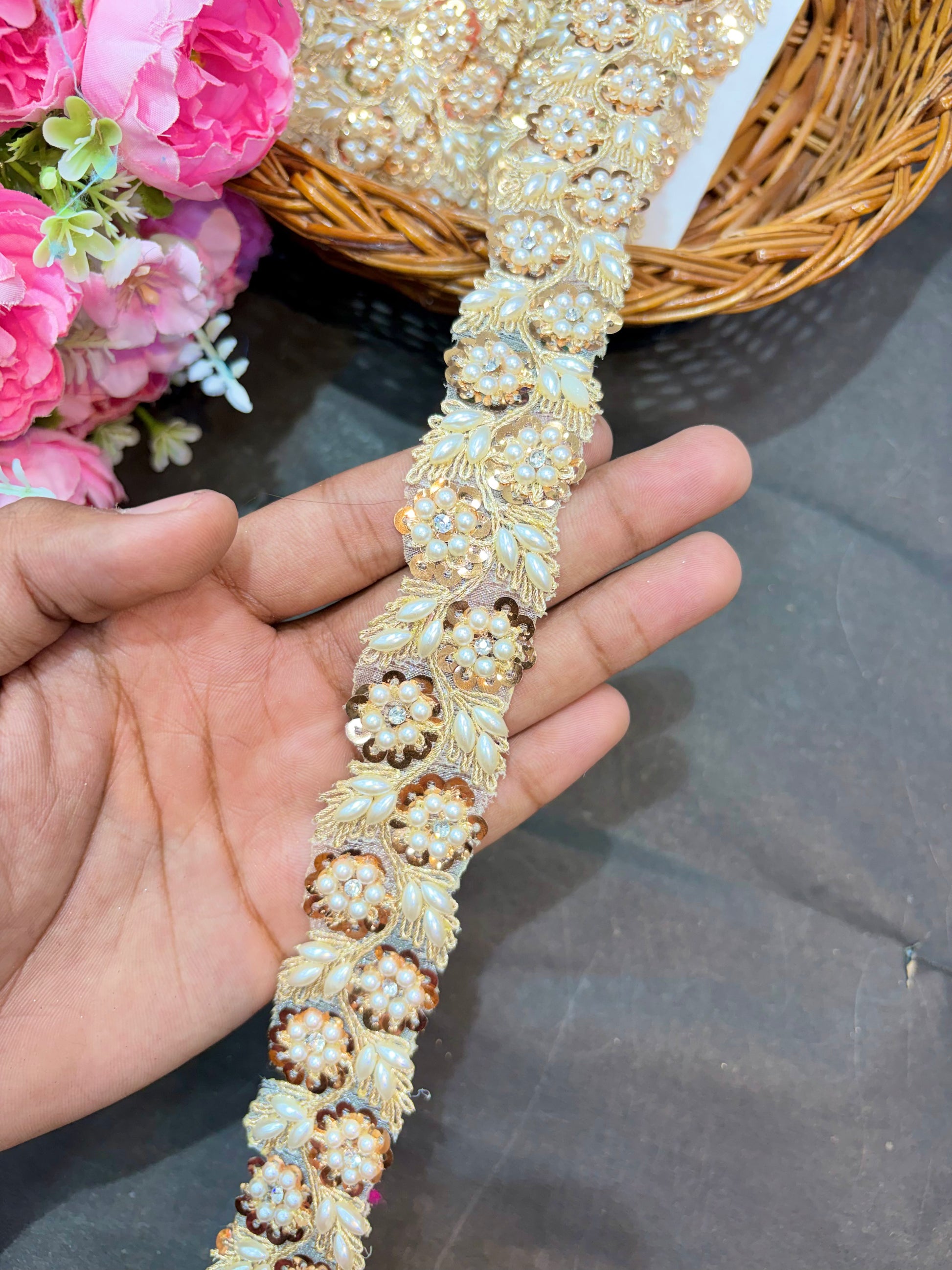 Beautiful dark golden Flower Pipe Work Zari Embroidered Saree Laces – 9 Meter Designer Border
