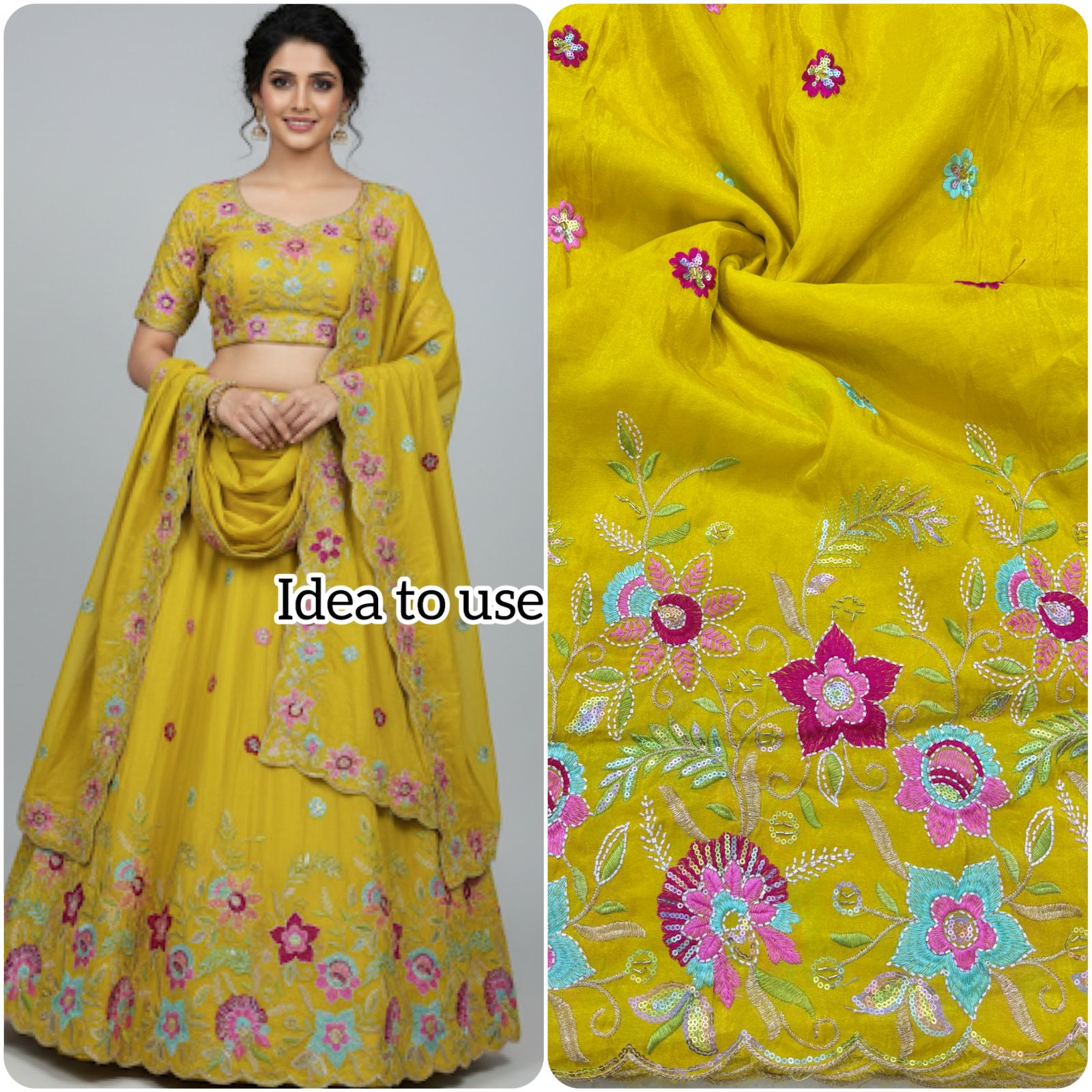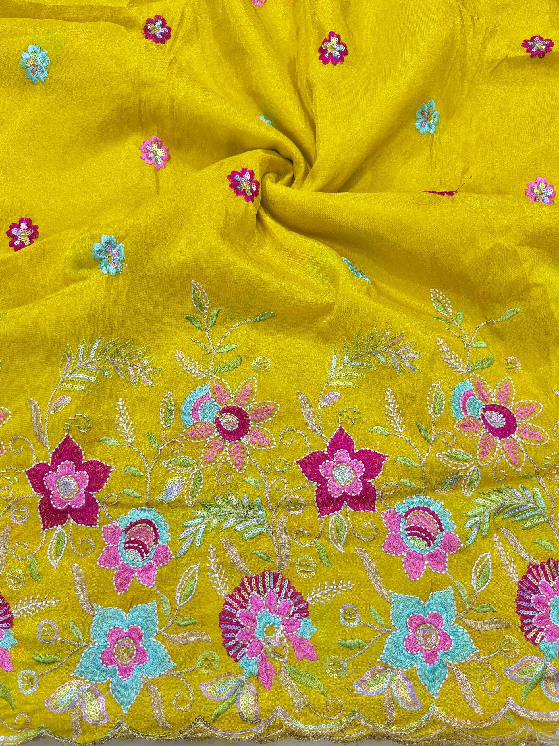 BEAUTIFUL YELLOW 😍PURE VICOUSE TISSUE MULTI FLOWER 🧵 EMBROIDERY WITH 🌺CUTWORK BORDER 44INCH WIDTH