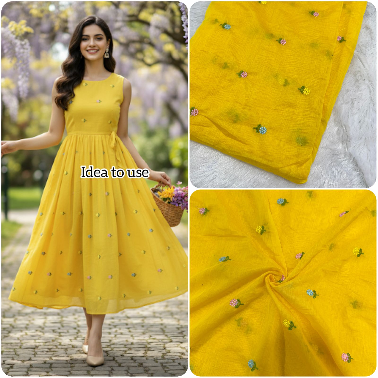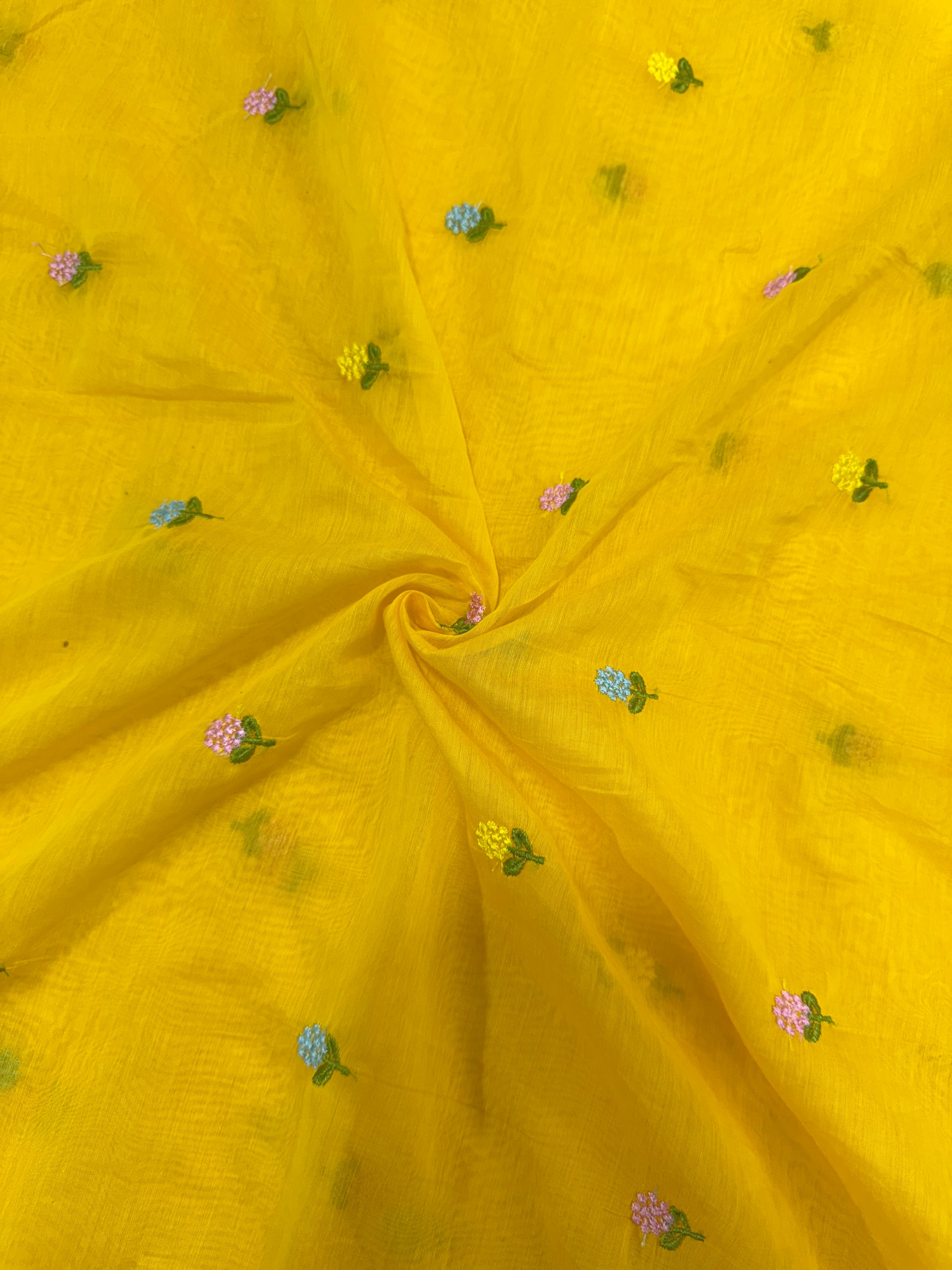 Add a vibrant and cheerful touch to your creations with this stunning bright yellow embroidered fabric. The fabric features a lightweight, breathable base with a soft texture, making it perfect for both ethnic and contemporary wear. Adorned with delicate multi-colored floral embroidery in pastel shades of pink, blue, and yellow with green leaves, it brings a fresh, lively charm to any outfit or décor piece.