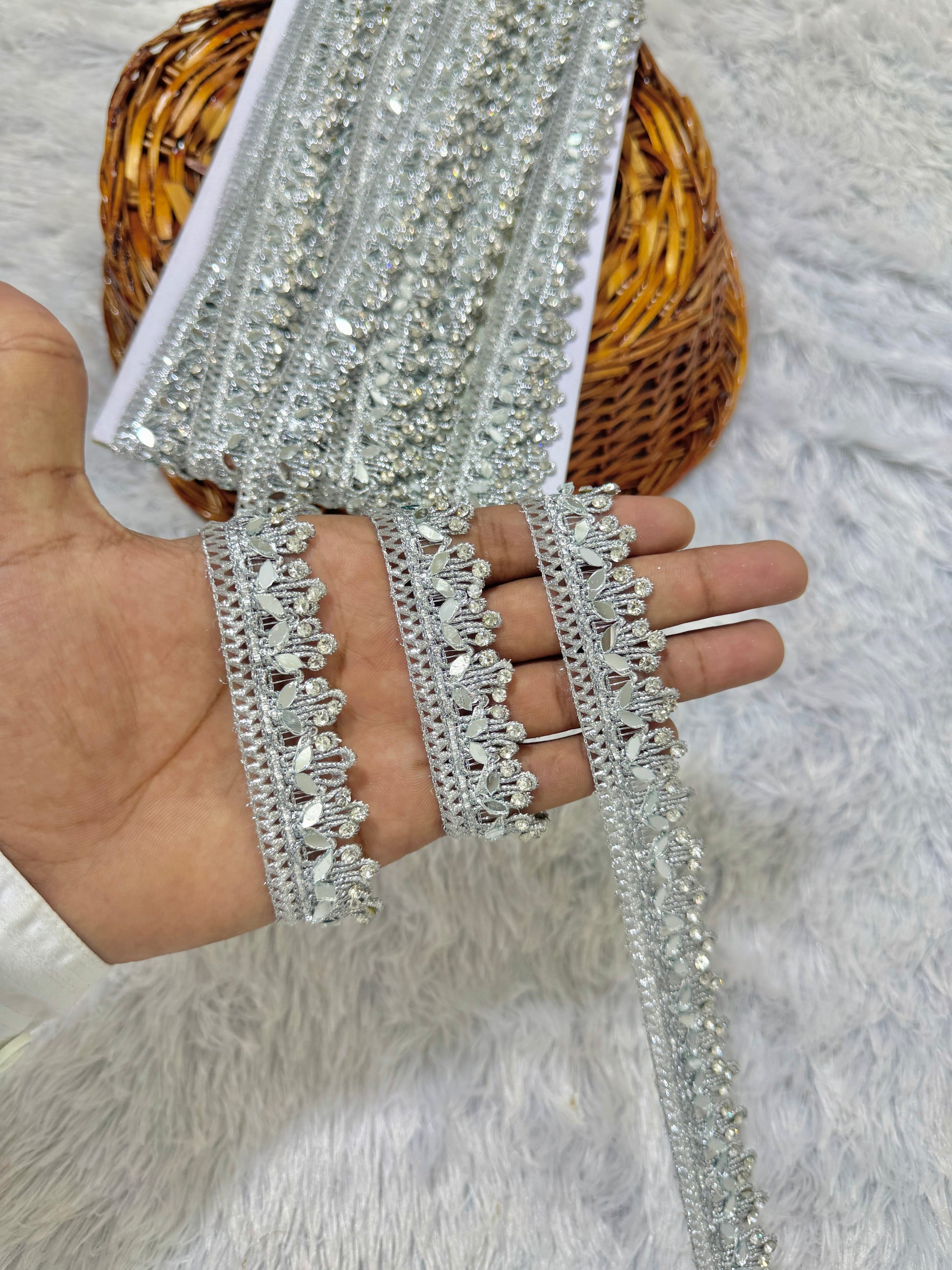 cuwork real mirror with stone lace border -9 meter ,2inch handcrafted decorative trim for sare ,lehengas and duppats silver