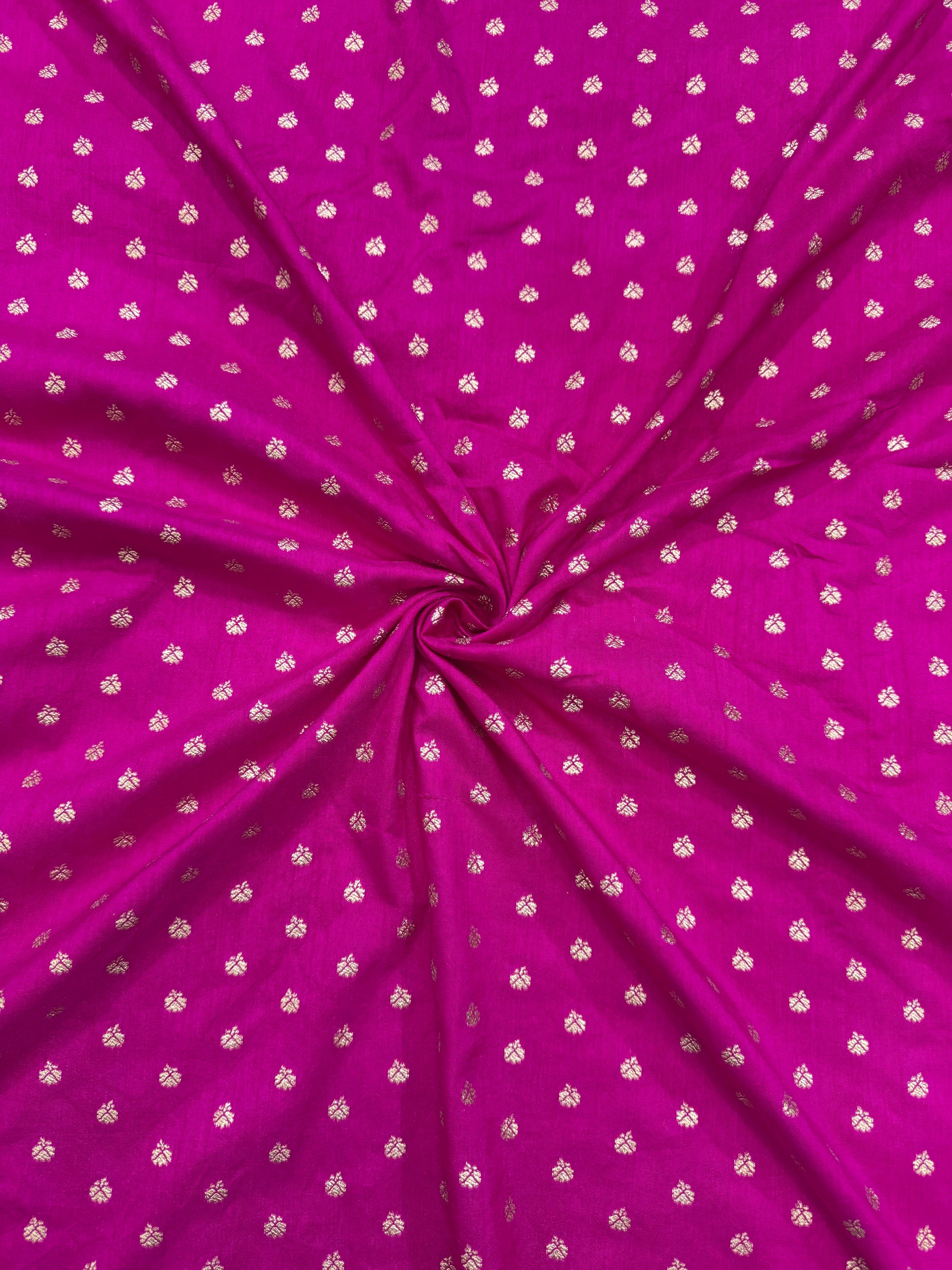 Bring elegance and radiance to your wardrobe with this bright PINK fabric adorned with golden buti motifs. The base fabric is soft, lightweight, and breathable, making it perfect for festive wear, traditional outfits, and party ensembles. The scattered metallic golden buti embroidery/weaving across the fabric adds a luxurious sheen and a timeless ethnic charm.
