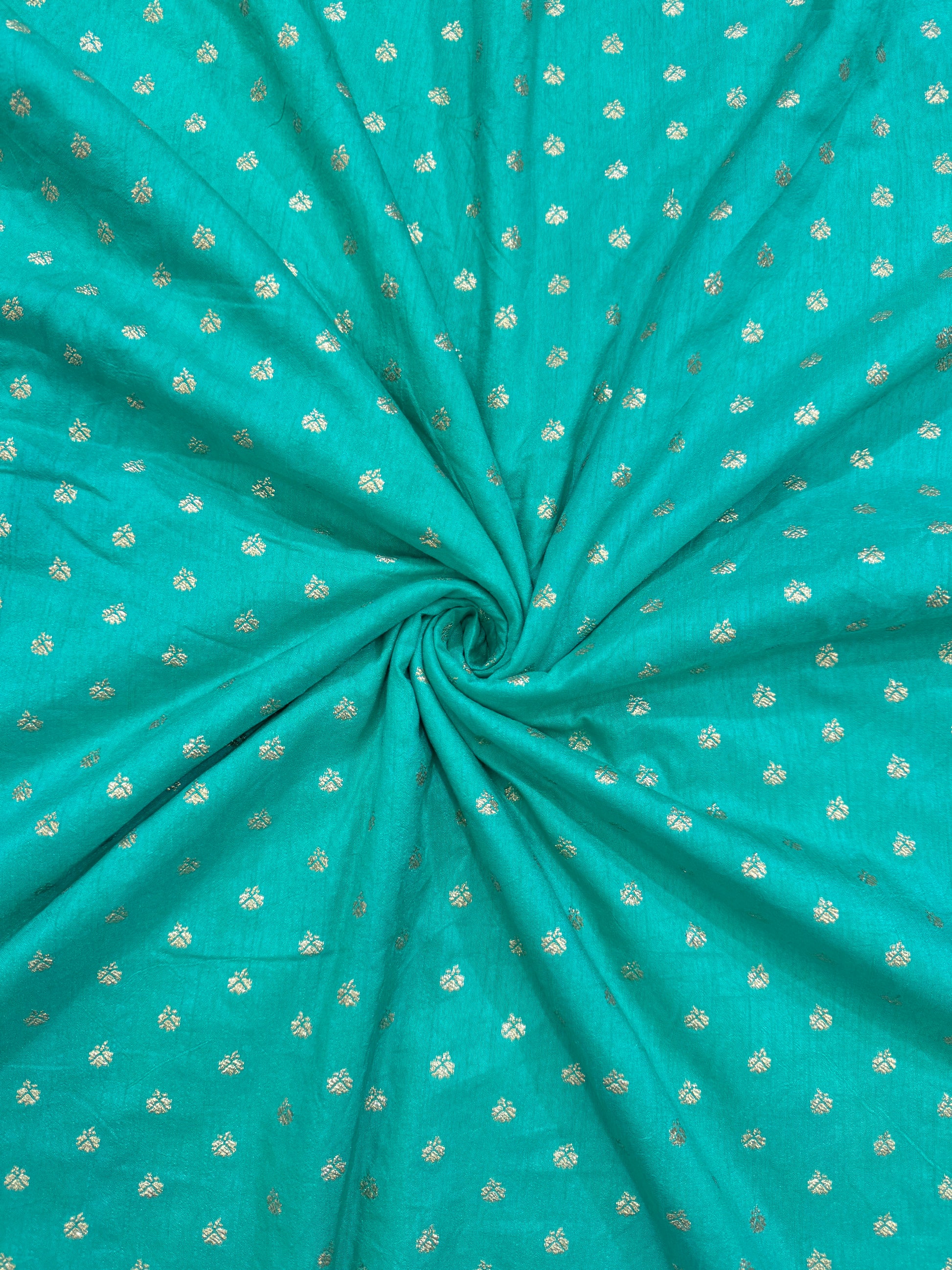 Bring elegance and radiance to your wardrobe with this bright Turquoise green fabric adorned with golden buti motifs. The base fabric is soft, lightweight, and breathable, making it perfect for festive wear, traditional outfits, and party ensembles. The scattered metallic golden buti embroidery/weaving across the fabric adds a luxurious sheen and a timeless ethnic charm.