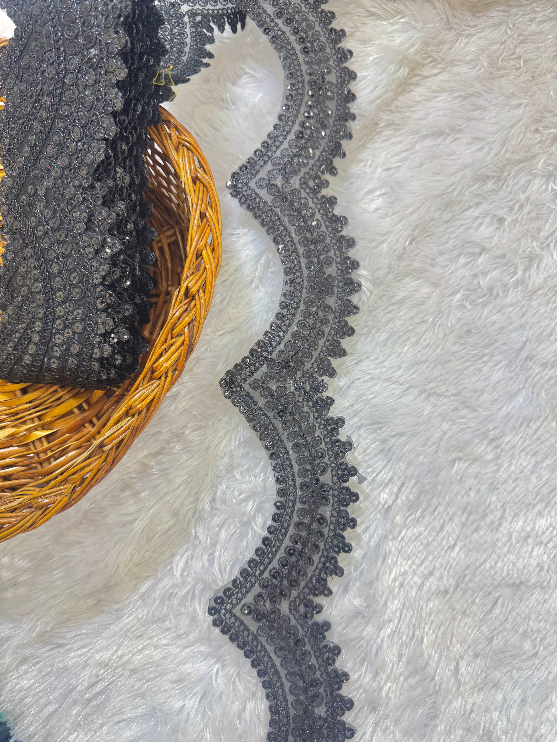 Add a luxurious touch to your outfits with this golden sequence embroidered lace border, featuring a beautiful wavy design and intricate detailing. Perfect for bridal wear, festive attire, and home décor. This lace enhances sarees, lehengas, dupattas, and gowns with a royal shine.