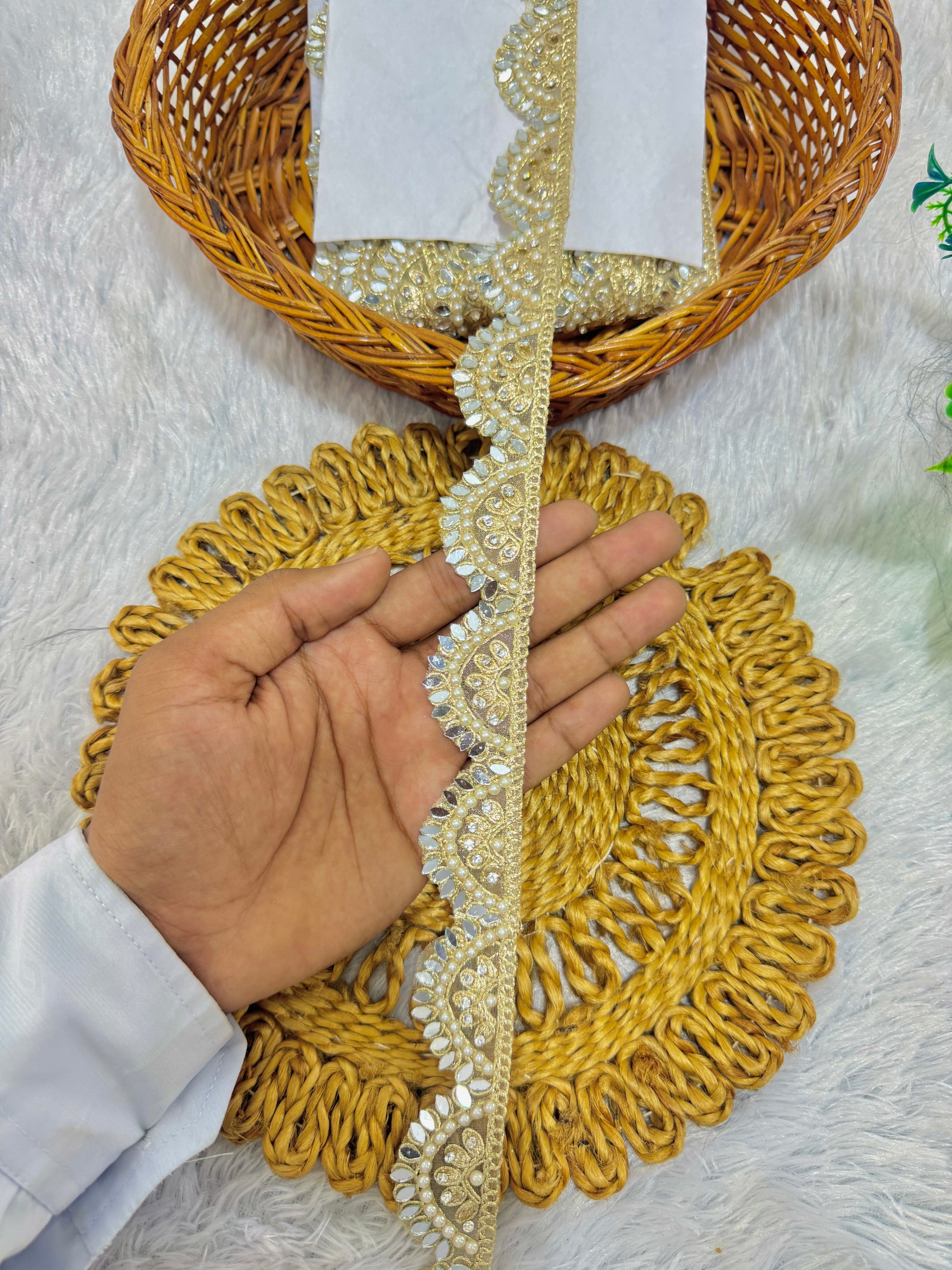 Golden Zari Embroidered Lace with Mirror Work – 9 Meter Pack