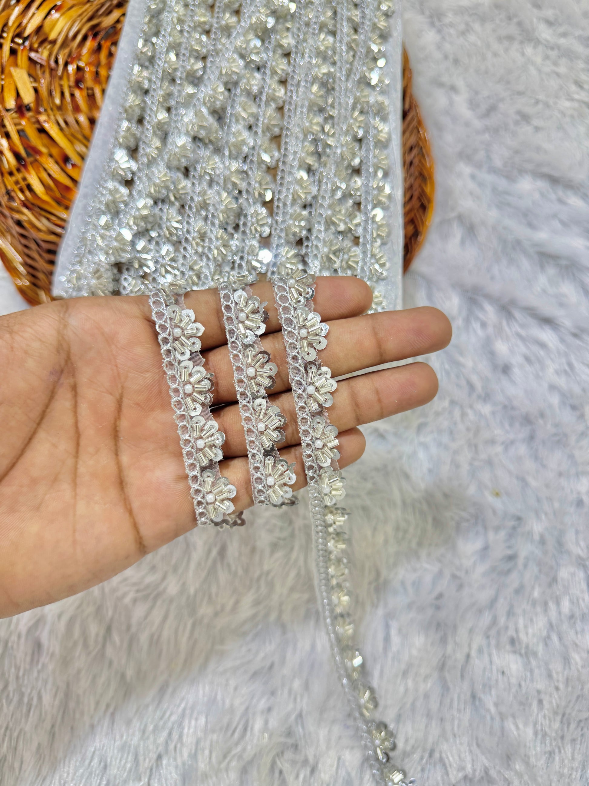 Handcrafted Cutdana & Diamond Lace Border on Net Fabric – 9 Meters, 1-Inch Embellished Trim for Sarees & Lehengas |SILVER