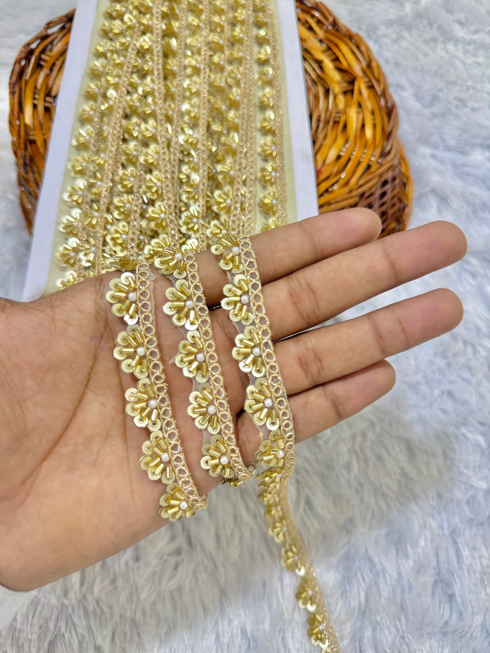 Handcrafted Cutdana & PULSE Lace Border on Net Fabric – 9 Meters, 1-Inch Embellished Trim for Sarees & Lehengas | GOLDEN