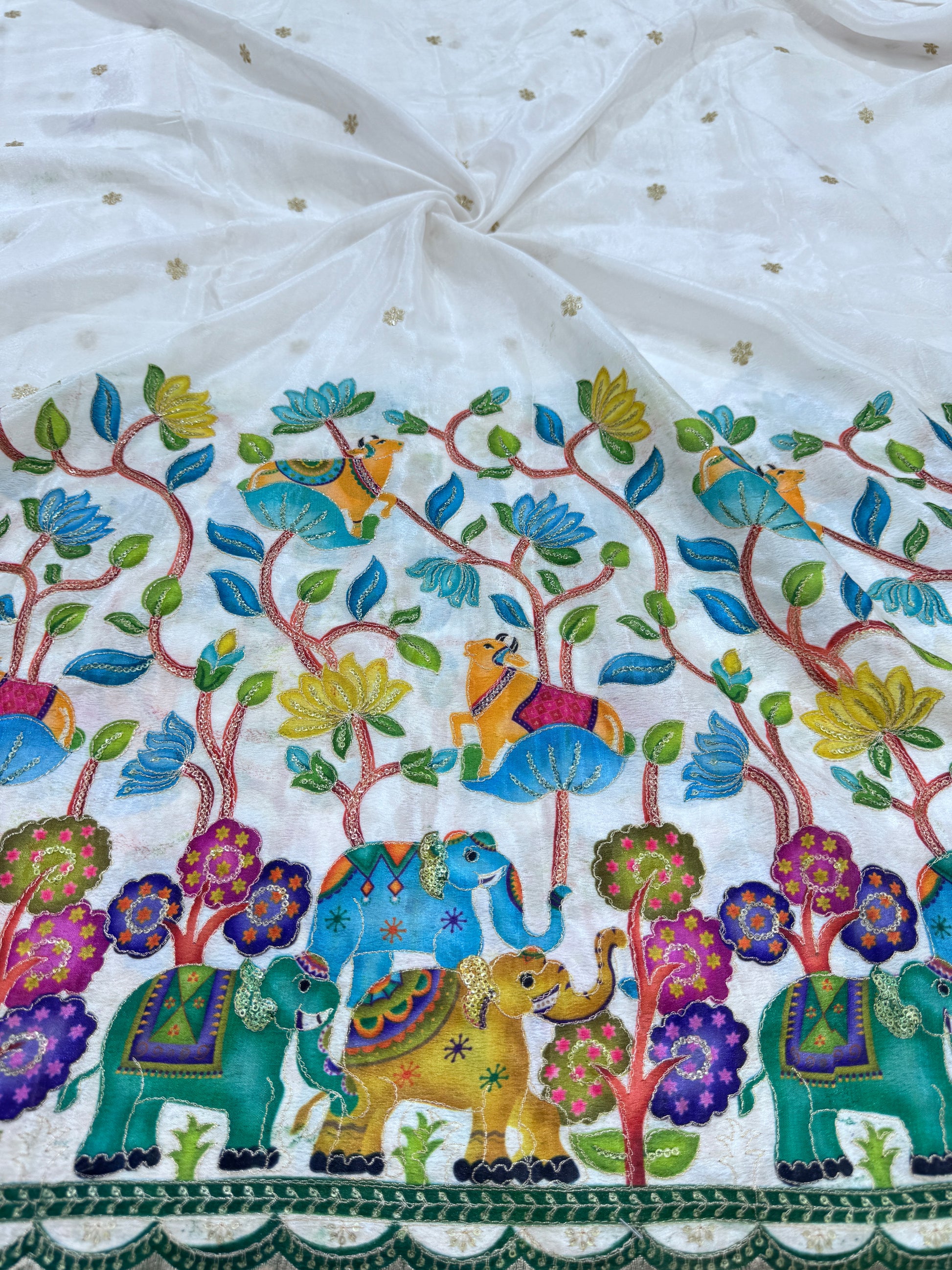 Elevate your premium clothing and saree collection with this Kalamkari Cow Design Chenon fabric. Crafted from high-quality material, it features a distinctive double-shaded color effect that enhances the traditional Kalamkari cow motif. With a 44-inch width, this fabric offers versatility and elegance for creating sophisticated garments that showcase artistic heritage and refined craftsmanship.