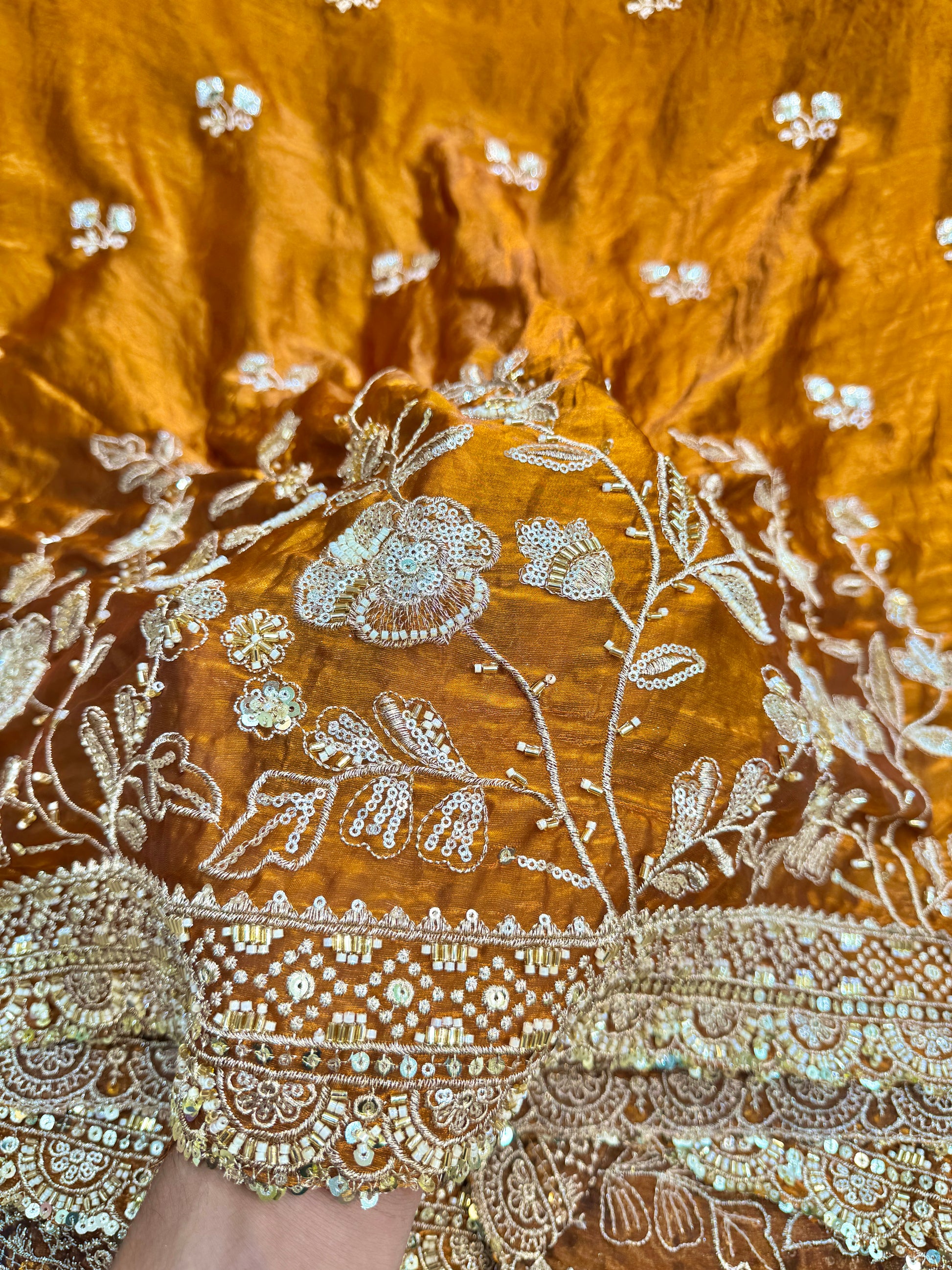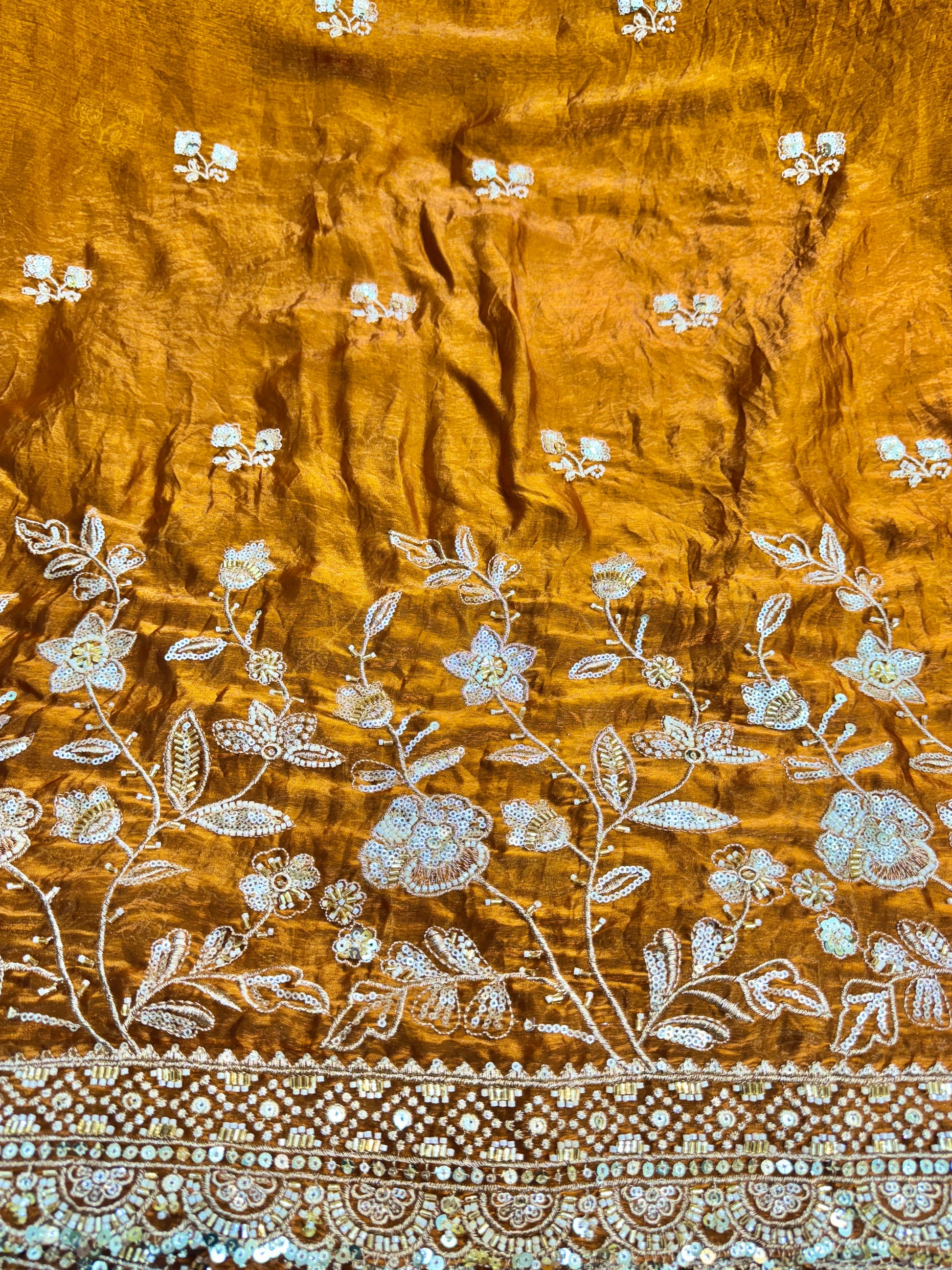 The detailed zari, sequins, and beadwork embroidery creates a luxurious golden shine against The highlight of this fabric is its heavily embroidered border with ornate motifs and intricate detailing, giving it a regal finish ideal for lehengas, dupattas, sarees, and anarkalis.