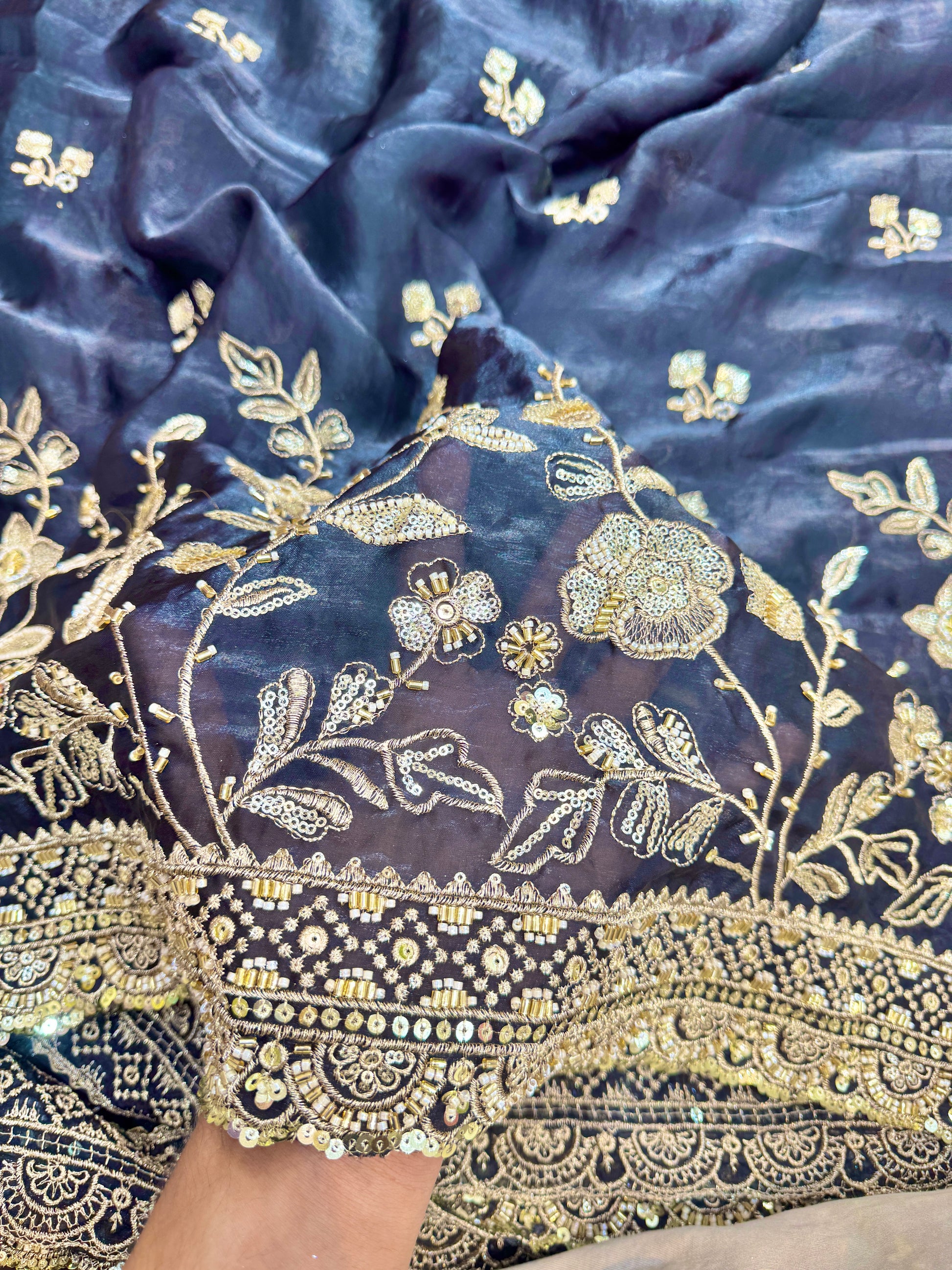 The detailed zari, sequins, and beadwork embroidery creates a luxurious golden shine against the deep navy base. The highlight of this fabric is its heavily embroidered border with ornate motifs and intricate detailing, giving it a regal finish ideal for lehengas, dupattas, sarees, and anarkalis.