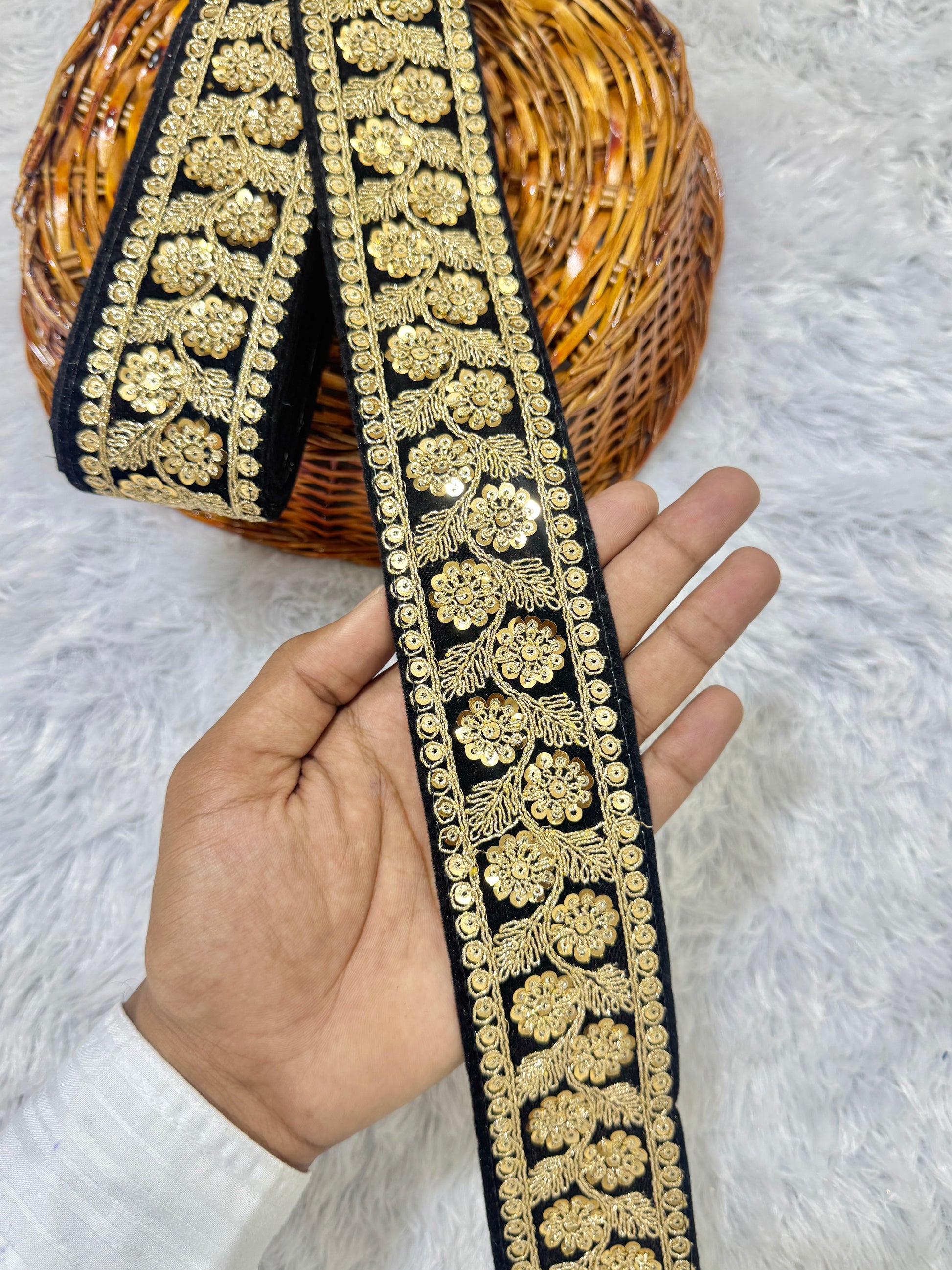 Luxury 🌸 flower Desing velvet fabrics with sequins work for lehanga dress blouse and etc pack of 9 meter black lace border sare lehaga blouse