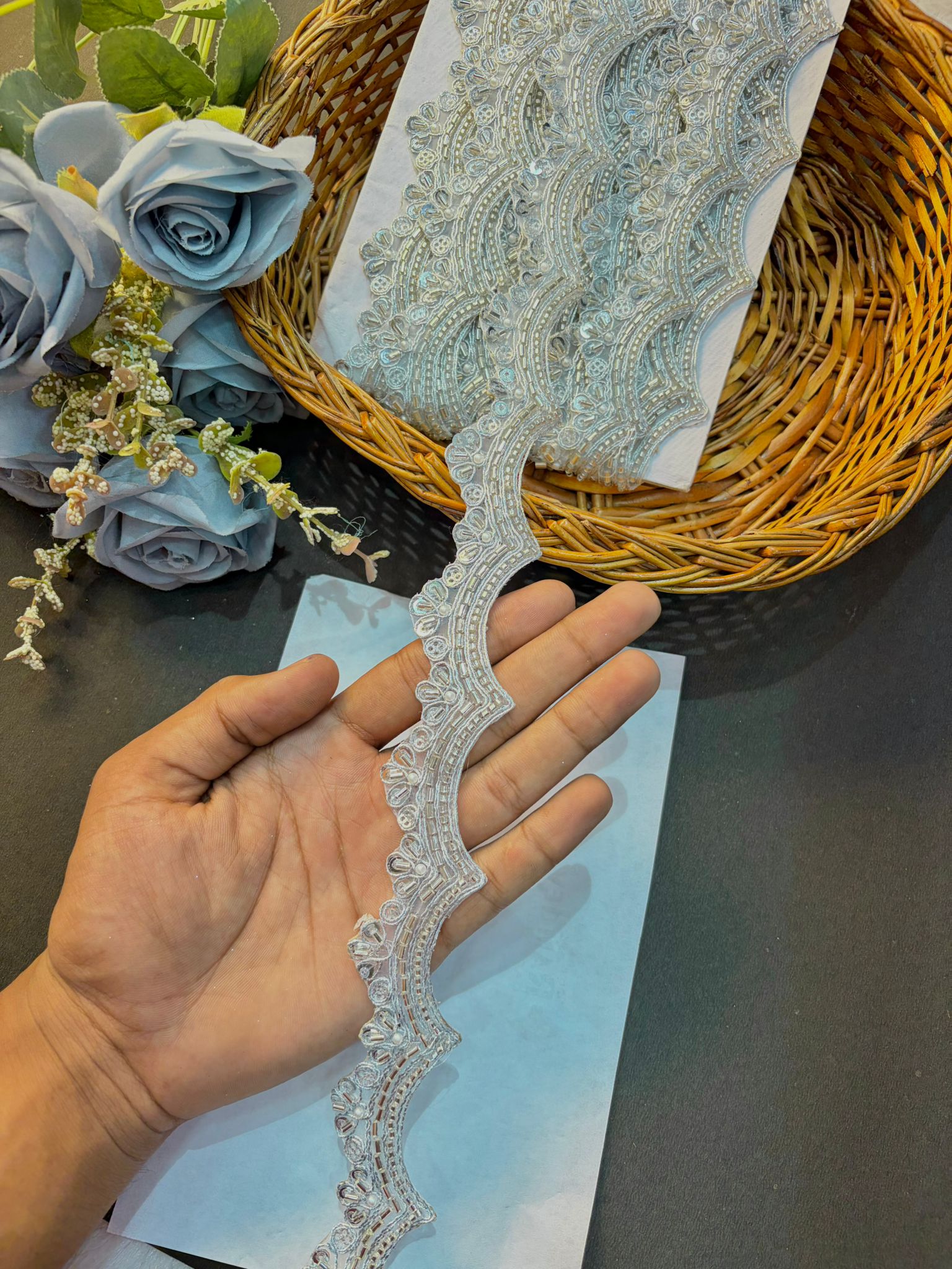 This premium lace features intricate zari work, shiny sequins, and delicate pearl embellishments that add a touch of elegance and sparkle.