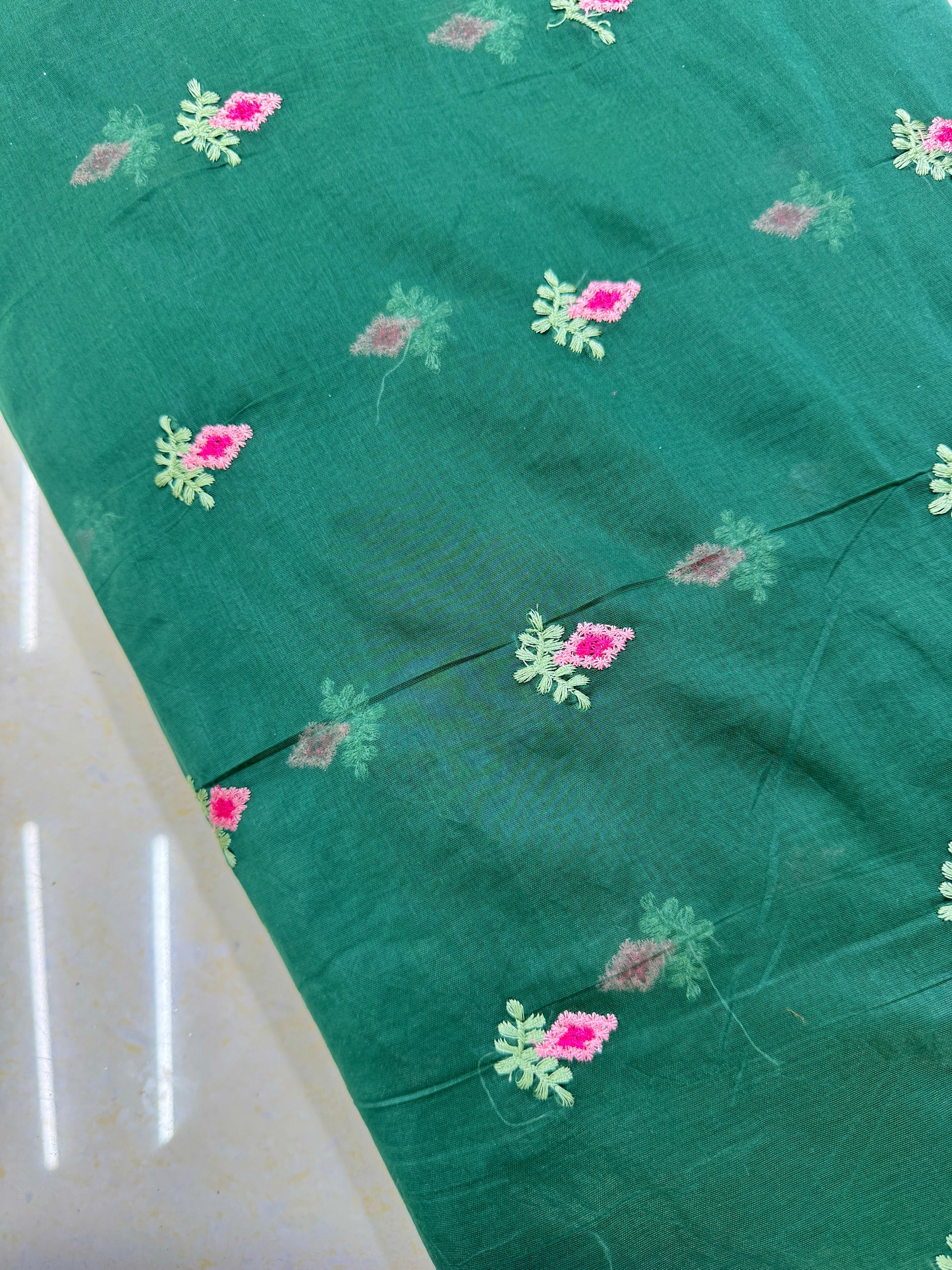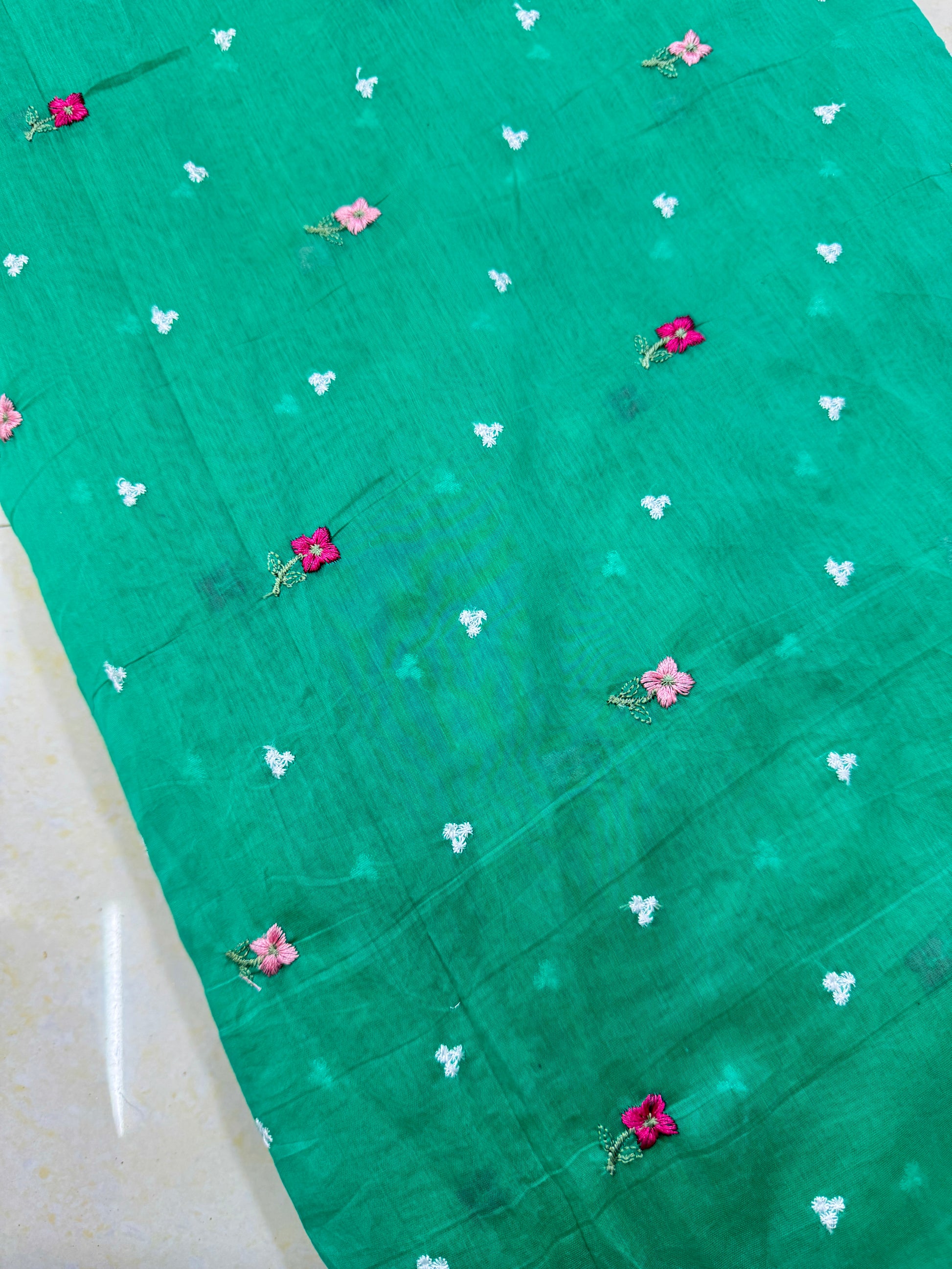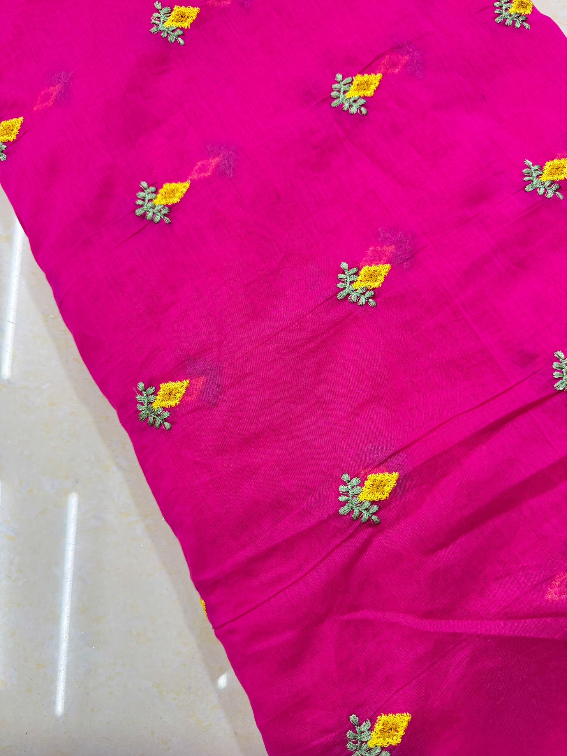 Add elegance to your ethnic wardrobe with this bright red embroidered fabric featuring beautiful yellow floral motifs and delicate green detailing. Made from soft and breathable cotton, this fabric is perfect for crafting sarees, kurtis, dresses, blouses, and festive wear.