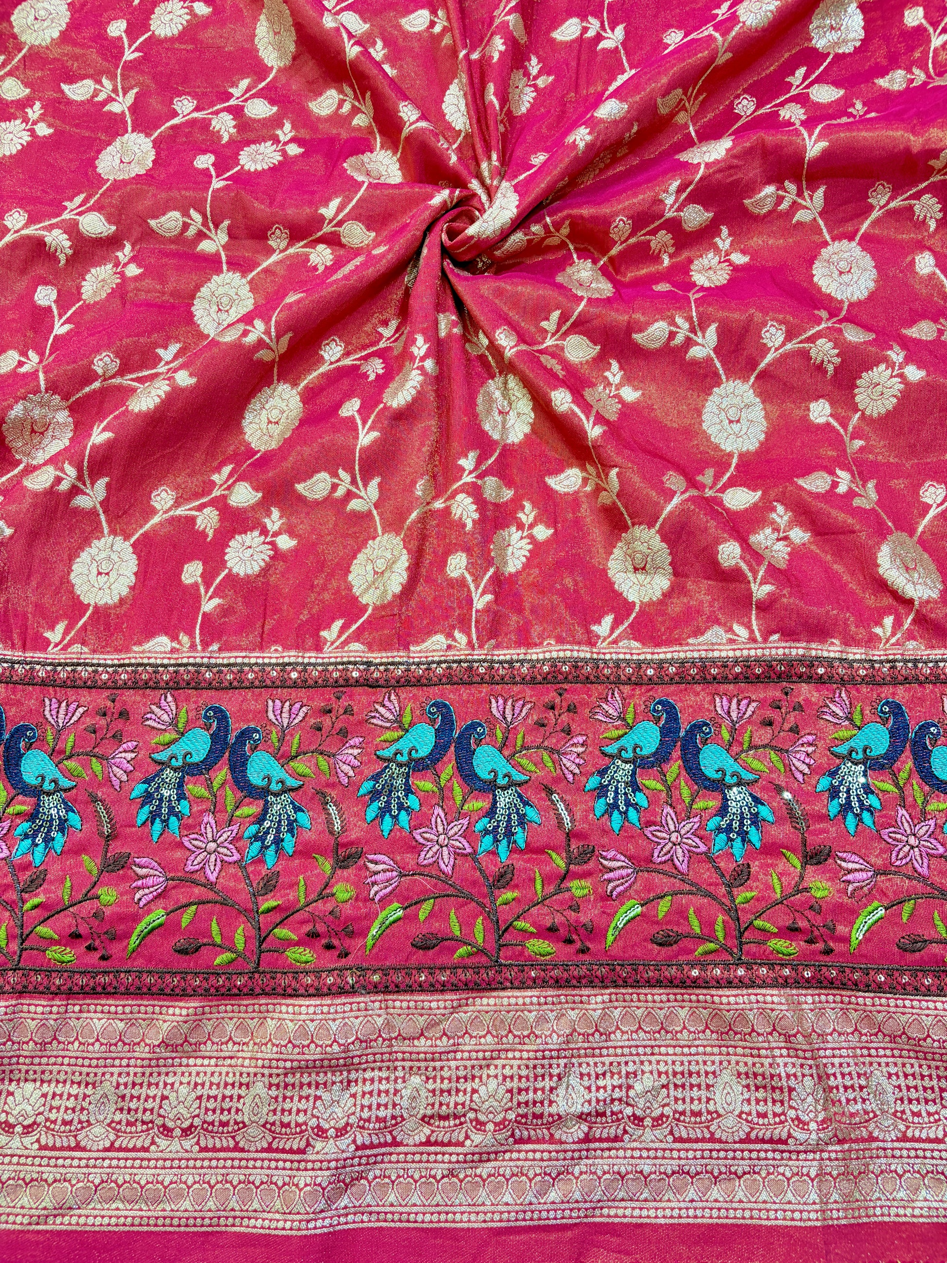 Paitanick Banarasi Jacquard Silk Fabric with Peacock Embroidery Border | Floral Zari Design Fabric 44-45 inch width