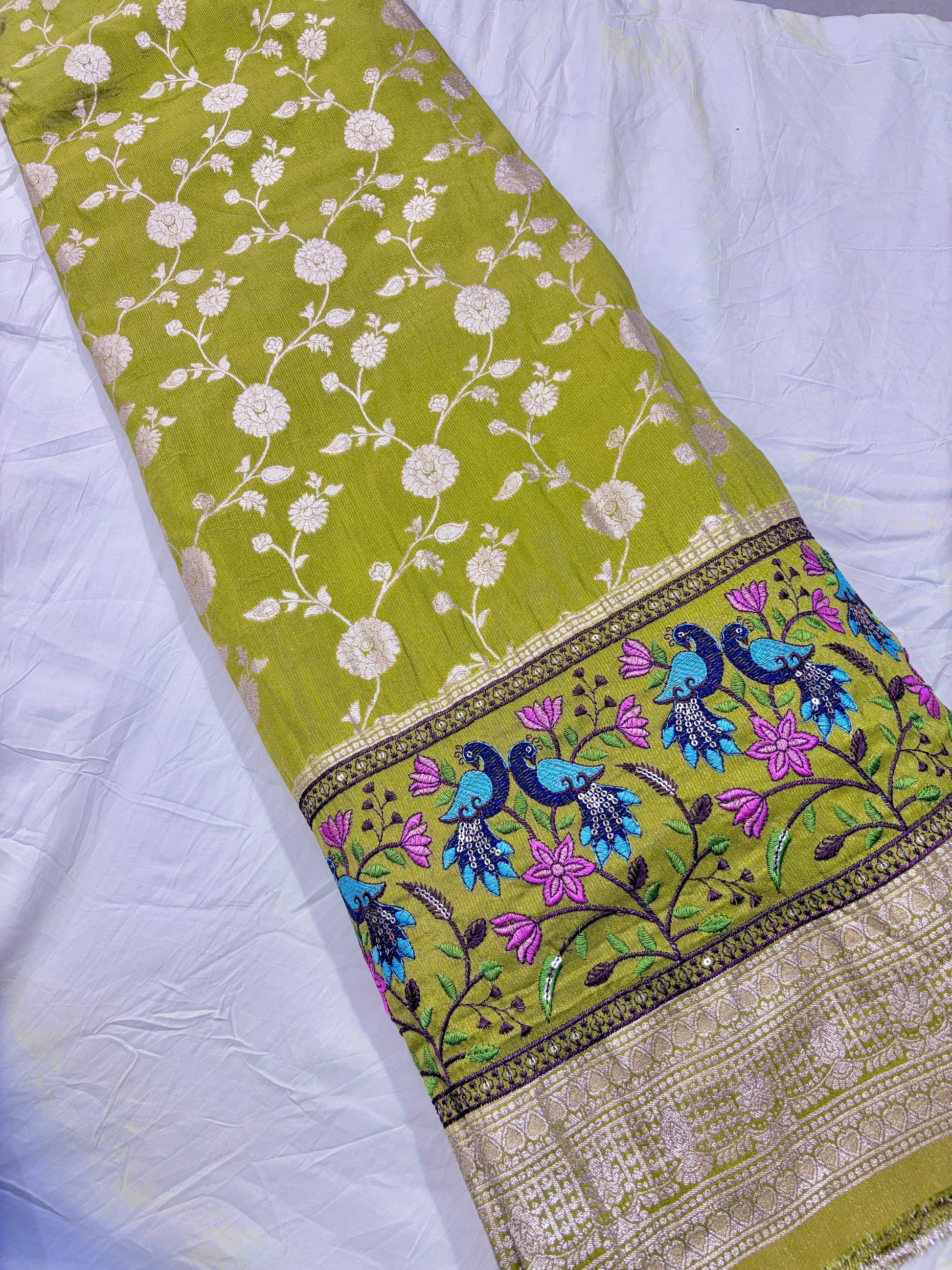Paitanick Banarasi Jacquard Silk Fabric with Peacock Embroidery Border | Floral Zari Design Fabric 44-45 inch width
