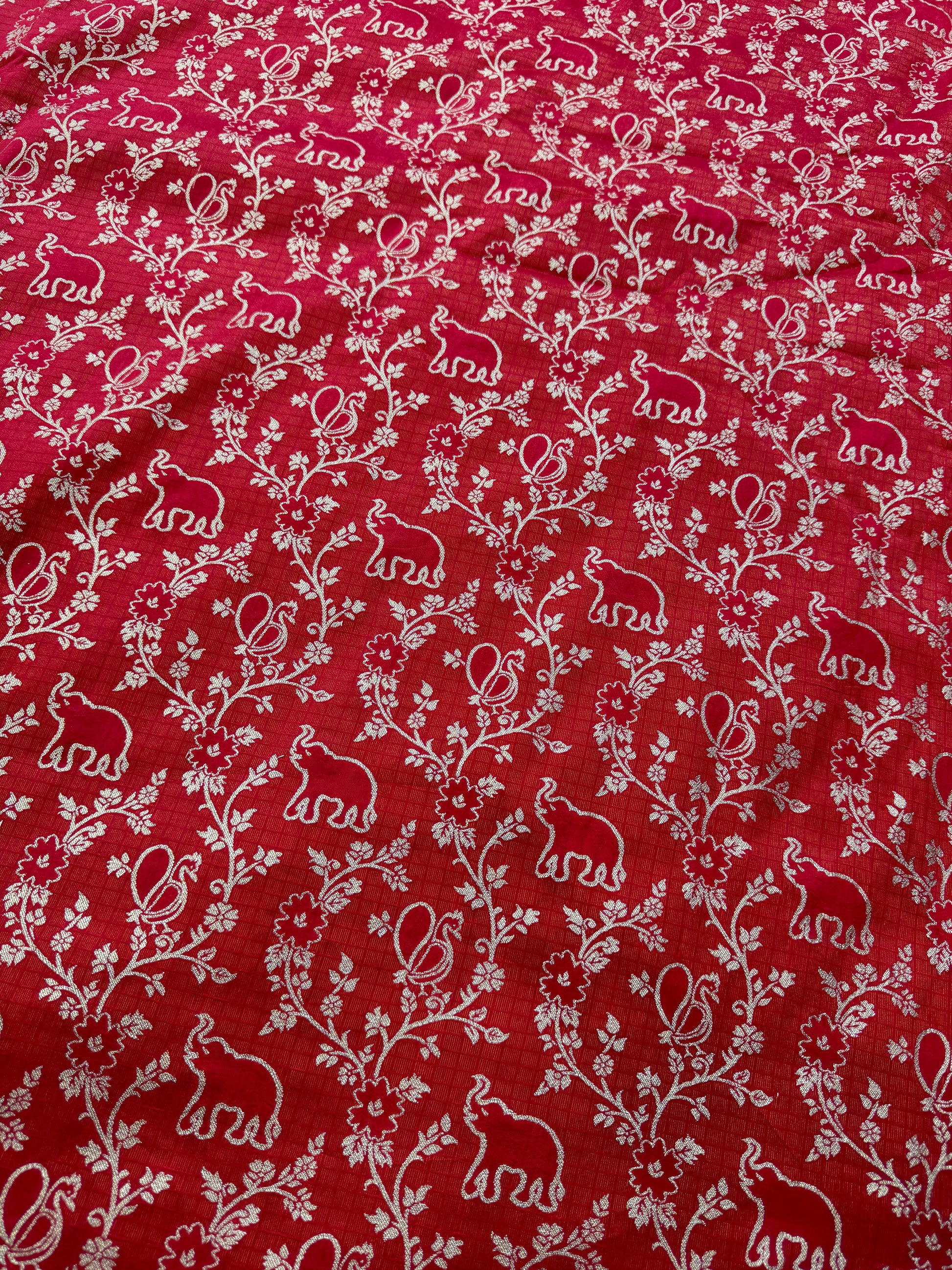 Premium Red Silk Brocade Banarasi Fabric with Elephant & Floral Motifs 44INCH WIDTH