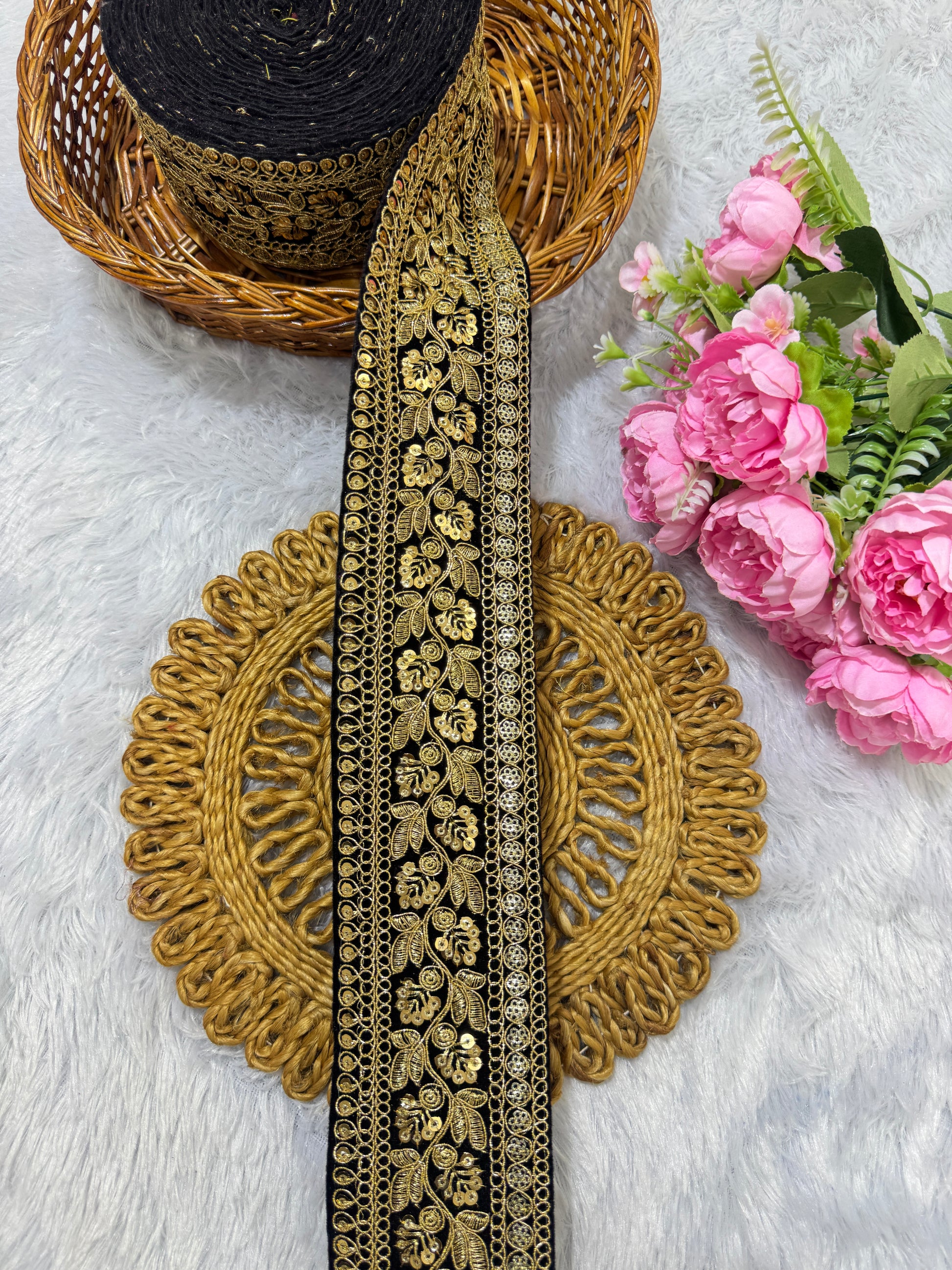 Premium velvet 3 inch gold Zari with sequins Embroidered border for sarees lehengas & Duppata’s Border 9 meter BLACK
