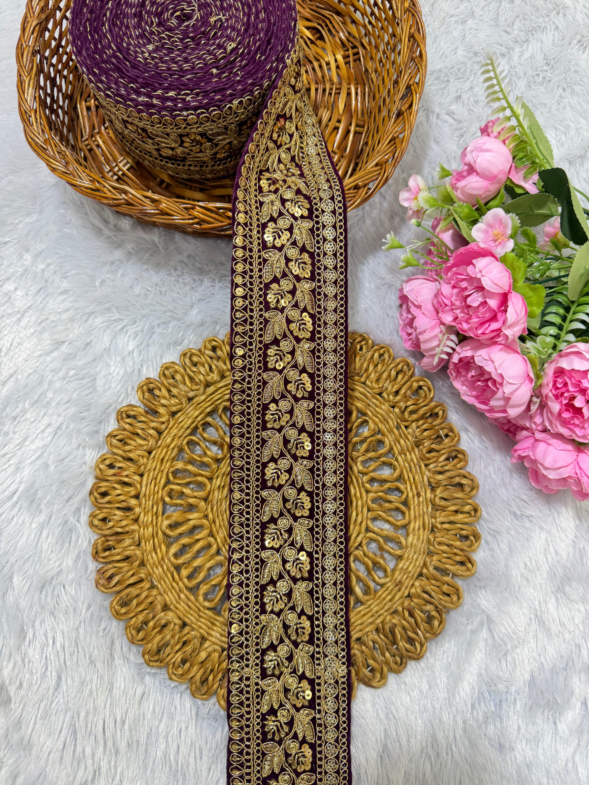 Premium velvet 3 inch gold Zari with sequins Embroidered border for sarees lehengas & Duppata’s Border 9 meter DARK PURPLE