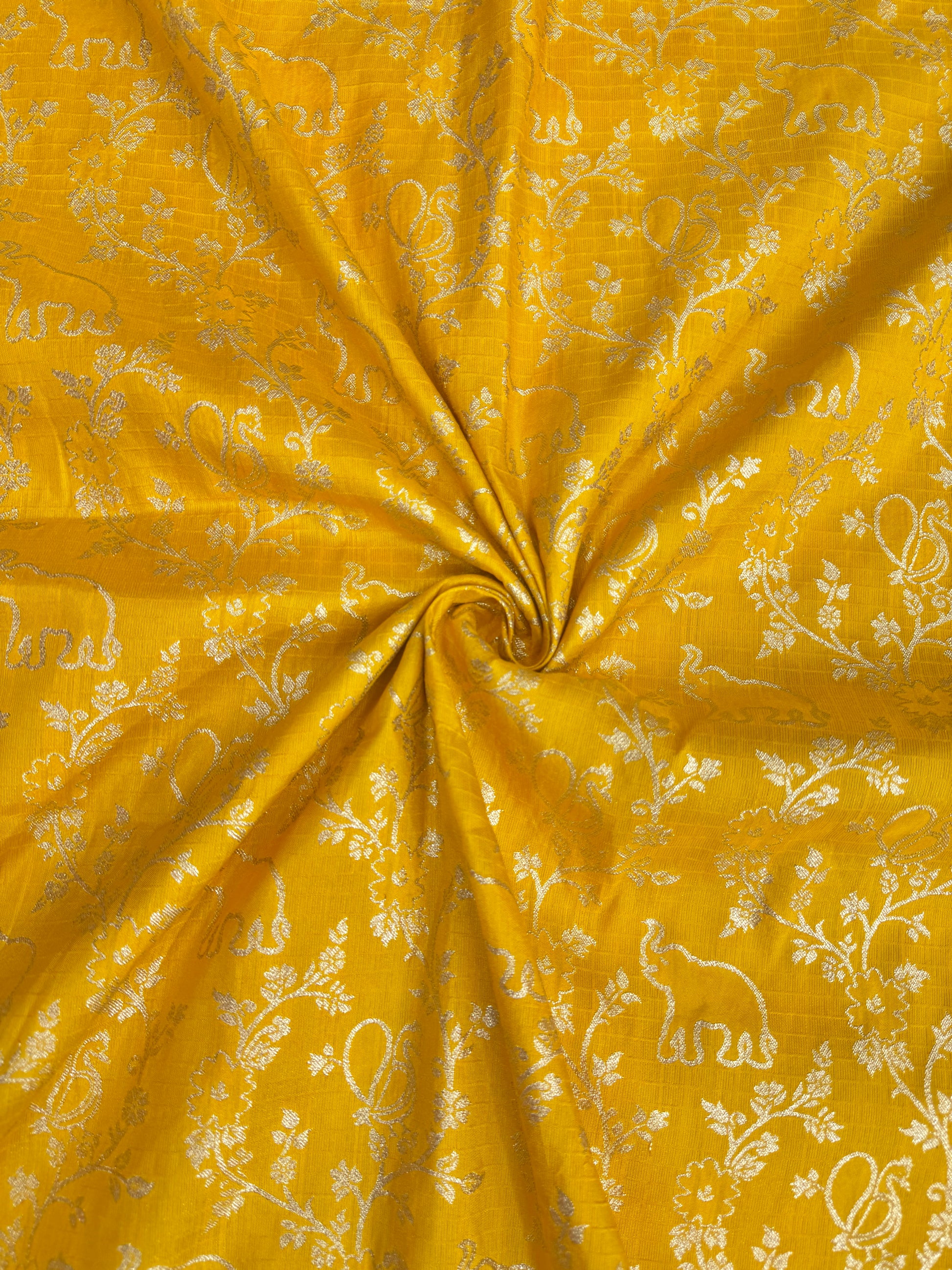 Premium yellow Silk Brocade Banarasi Fabric with Elephant & Floral Motifs 44INCH WIDTH