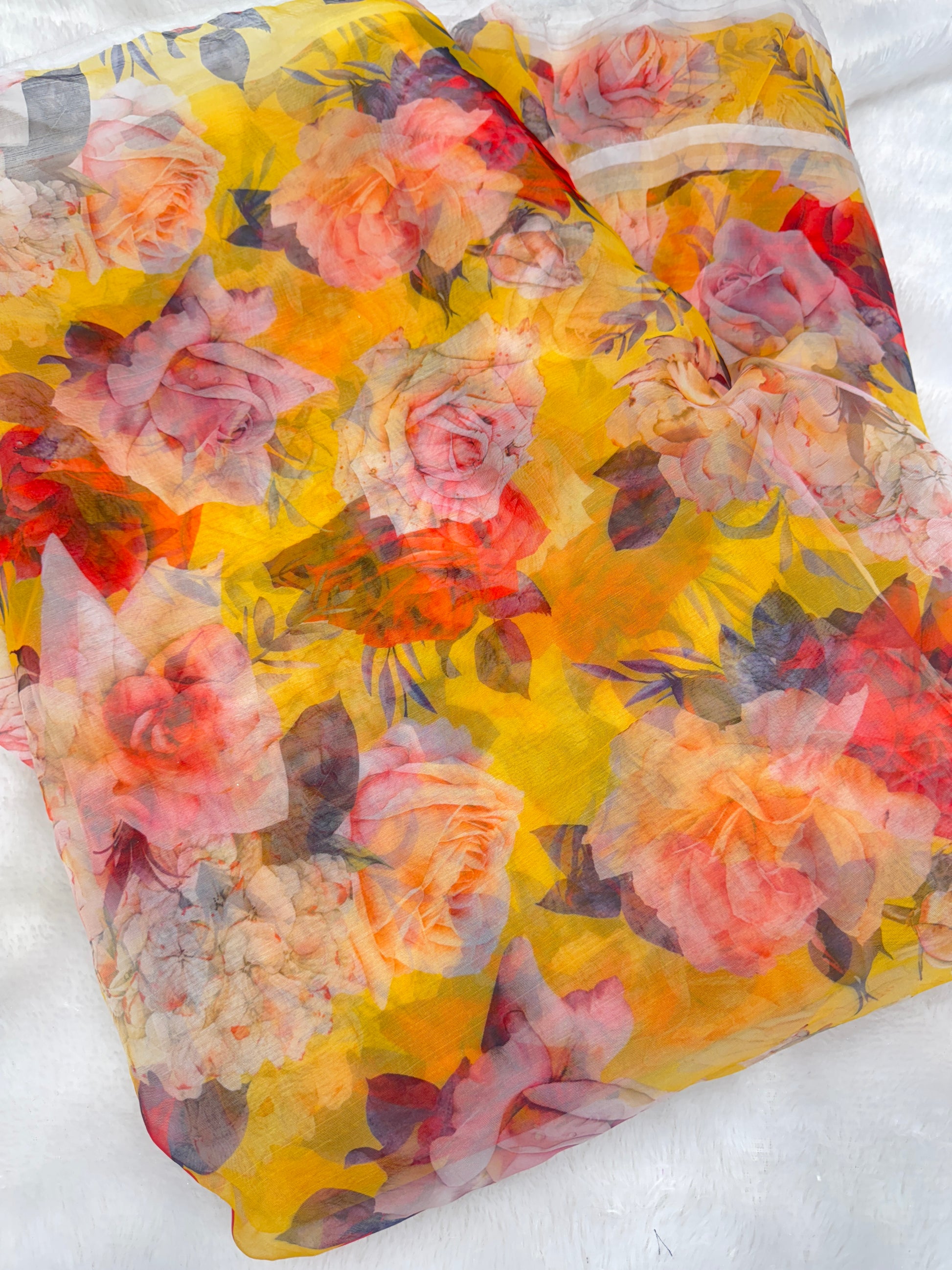Elevate your designs with this exquisite floral print on sheer organza. The elegant blossoms and soft branches are rendered in a style, creating a dreamy and artistic look. Its delicate drape and lightweight feel make it ideal for layered skirts, airy sleeves, or sophisticated scarves. This fabric adds a touch of timeless beauty to any collection.