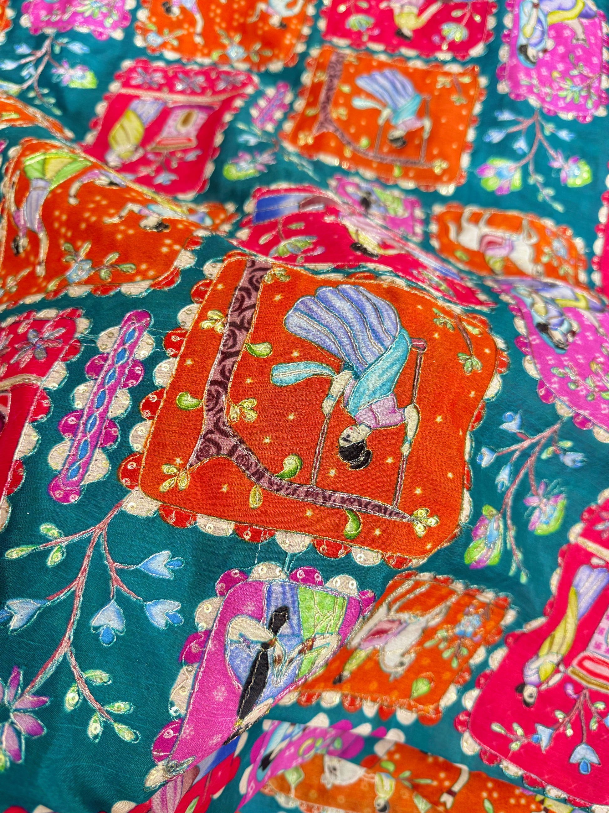Adds a royal touch to your creations with Panna 44 Pure Chenon fabric, featuring an exquisite Raja–Rani position print. This fabric displays intricate and colorful traditional motifs, including royal couples, elephants, and floral patterns, all beautifully enriched with fine thread and zari work. Its smooth chenon texture offers a soft feel and graceful drape, making it perfect for sarees, kurtis, lehengas, dupattas, and even home décor projects.