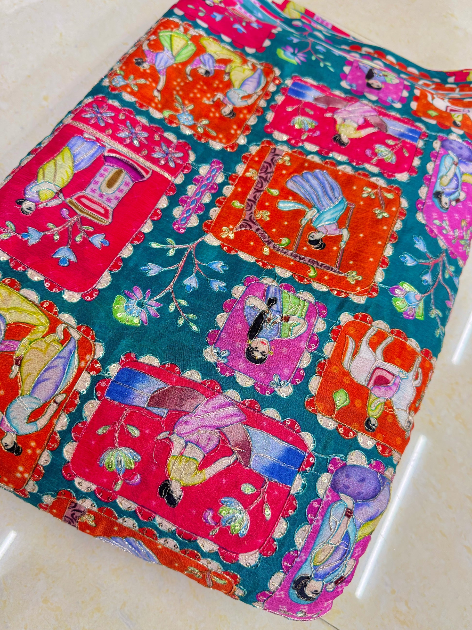 Adds a royal touch to your creations with Panna 44 Pure Chenon fabric, featuring an exquisite Raja–Rani position print. This fabric displays intricate and colorful traditional motifs, including royal couples, elephants, and floral patterns, all beautifully enriched with fine thread and zari work. Its smooth chenon texture offers a soft feel and graceful drape, making it perfect for sarees, kurtis, lehengas, dupattas, and even home décor projects.