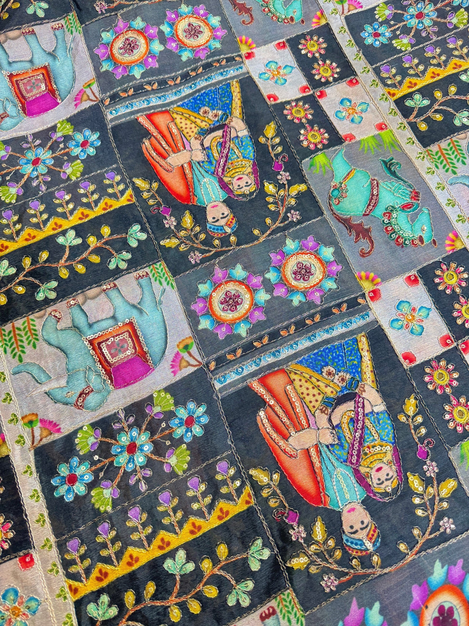 Adds a royal touch to your creations with Panna 44 Pure Chenon fabric, featuring an exquisite Raja–Rani position print. This fabric displays intricate and colorful traditional motifs, including royal couples, elephants, and floral patterns, all beautifully enriched with fine thread and zari work. Its smooth chenon texture offers a soft feel and graceful drape, making it perfect for sarees, kurtis, lehengas, dupattas, and even home décor projects.