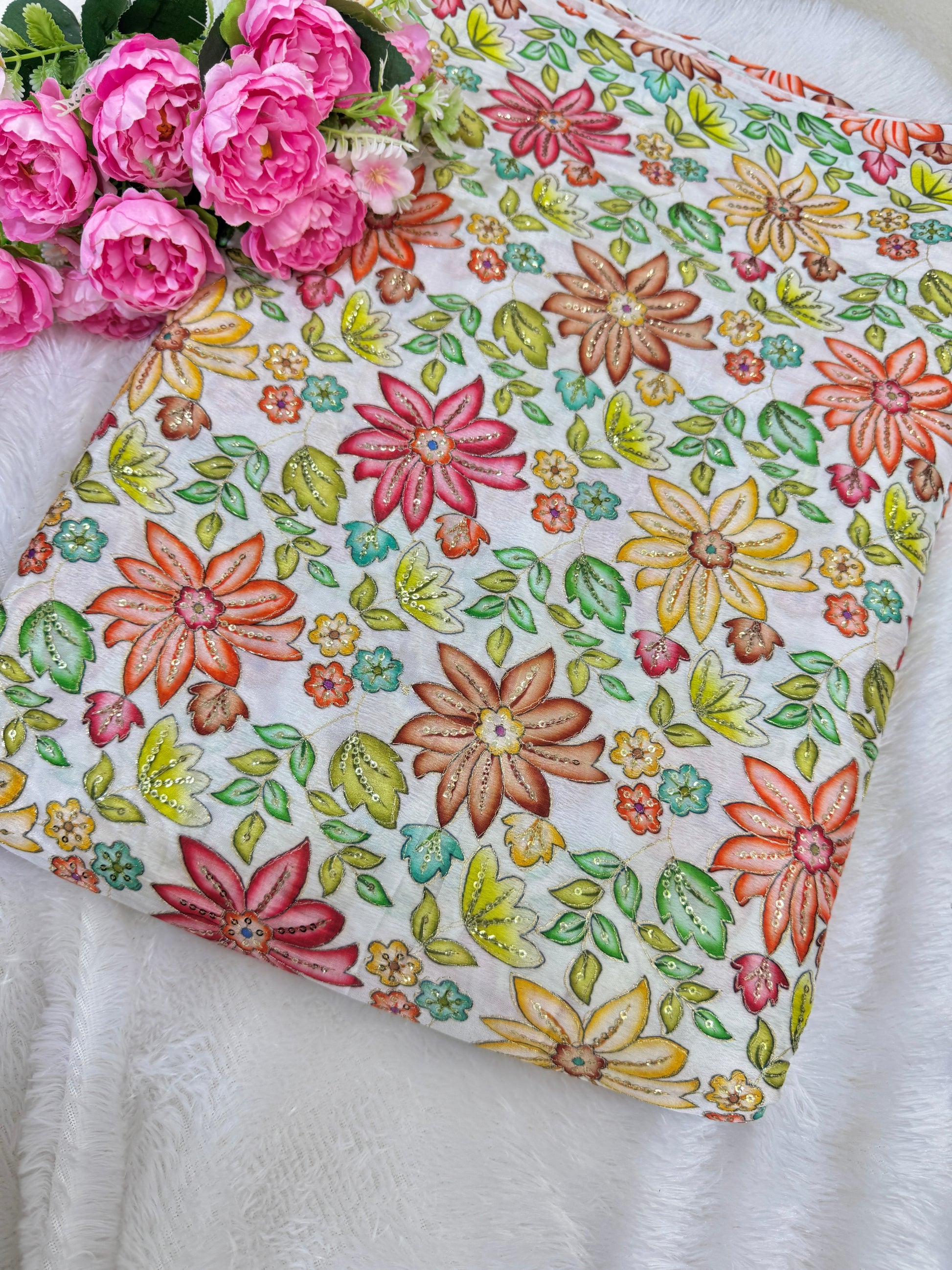 Pure chinon fabrics with multi flower 💐 44inch width lehanga ,blouse, frock, dress white