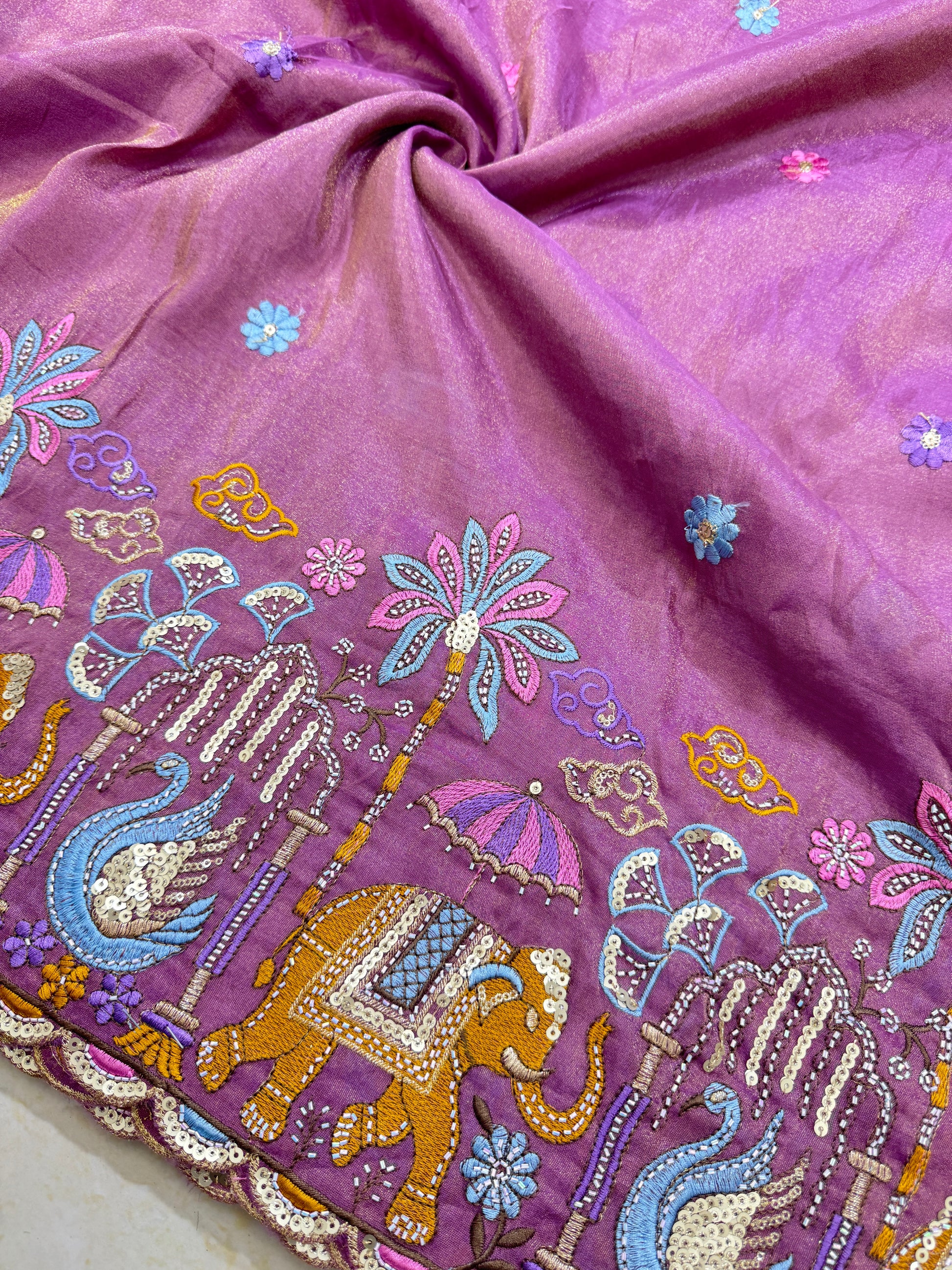 3. Embroidery Colors: The multi-color threadwork (elephants, swans, flowers) can be tailored to specific shade palettes.