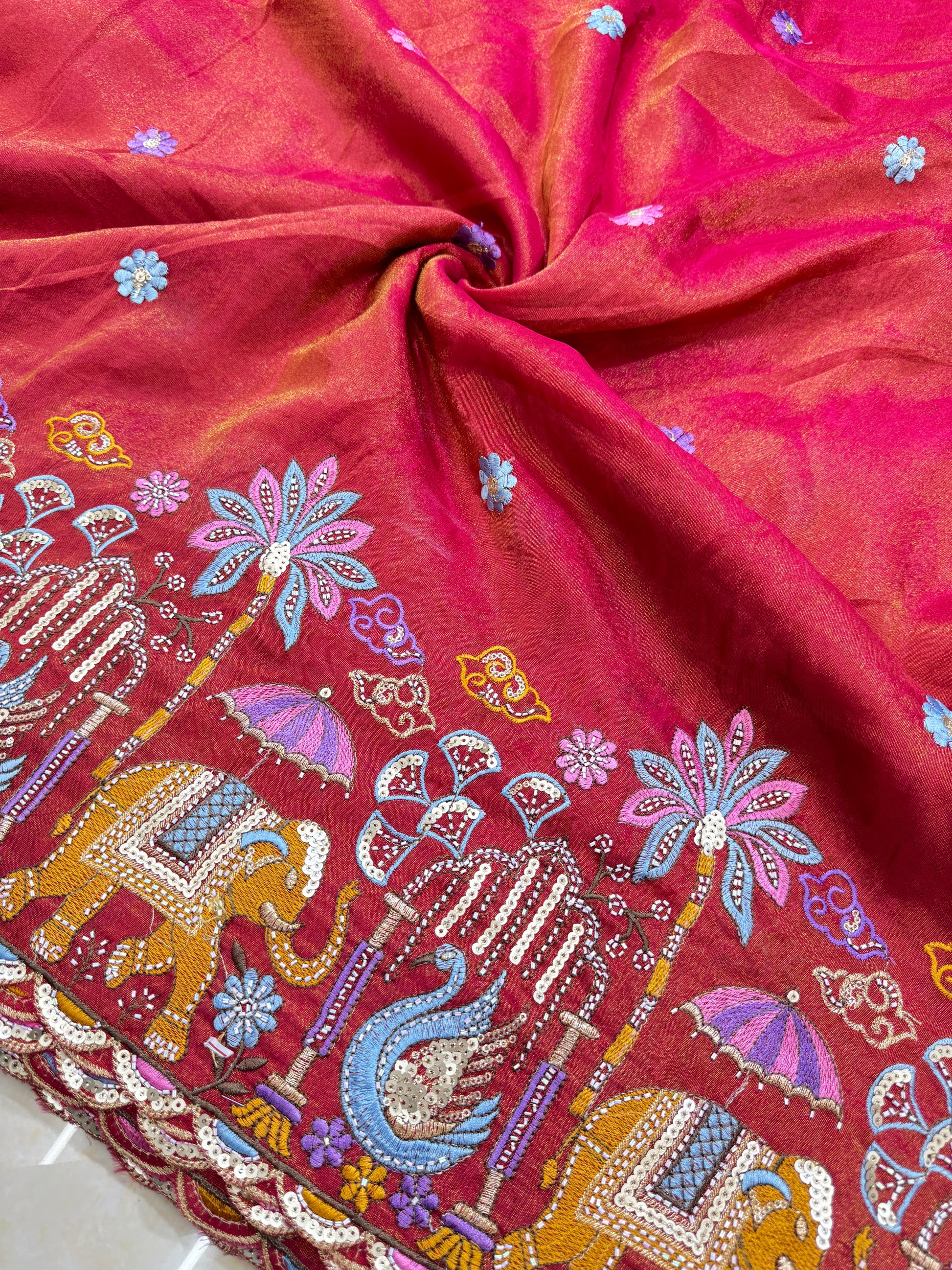 1. Fabric Base: While the displayed piece uses a silk-like blend, the same embroidery design could potentially be applied to various base fabrics like Pure Tissue, Quality Viscose, Georgette, or Pure Silk.