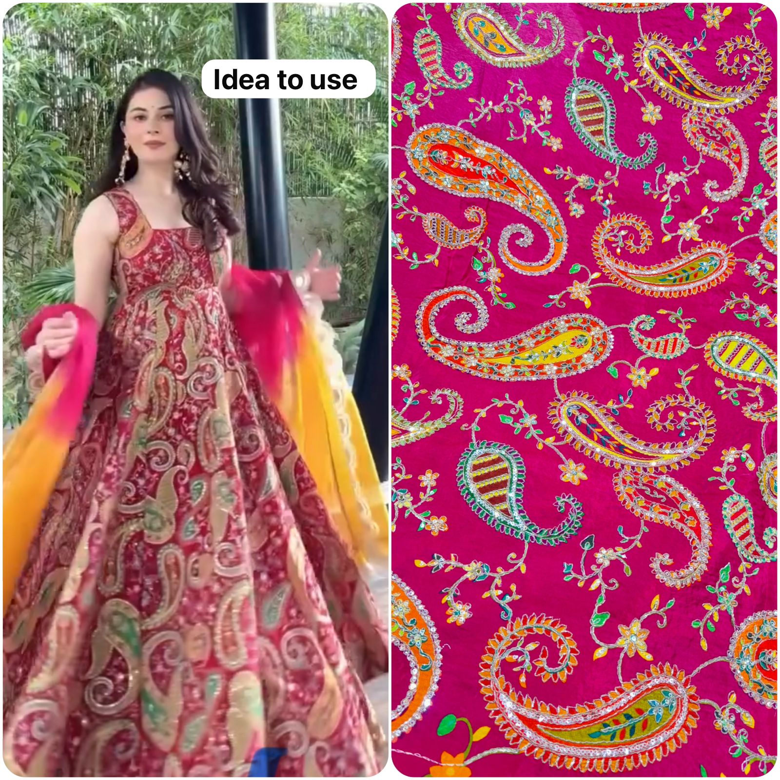 This 44 inch width fabric is perfect for creating stunning suits, lehngas, gowns, and coordination sets. The intricate