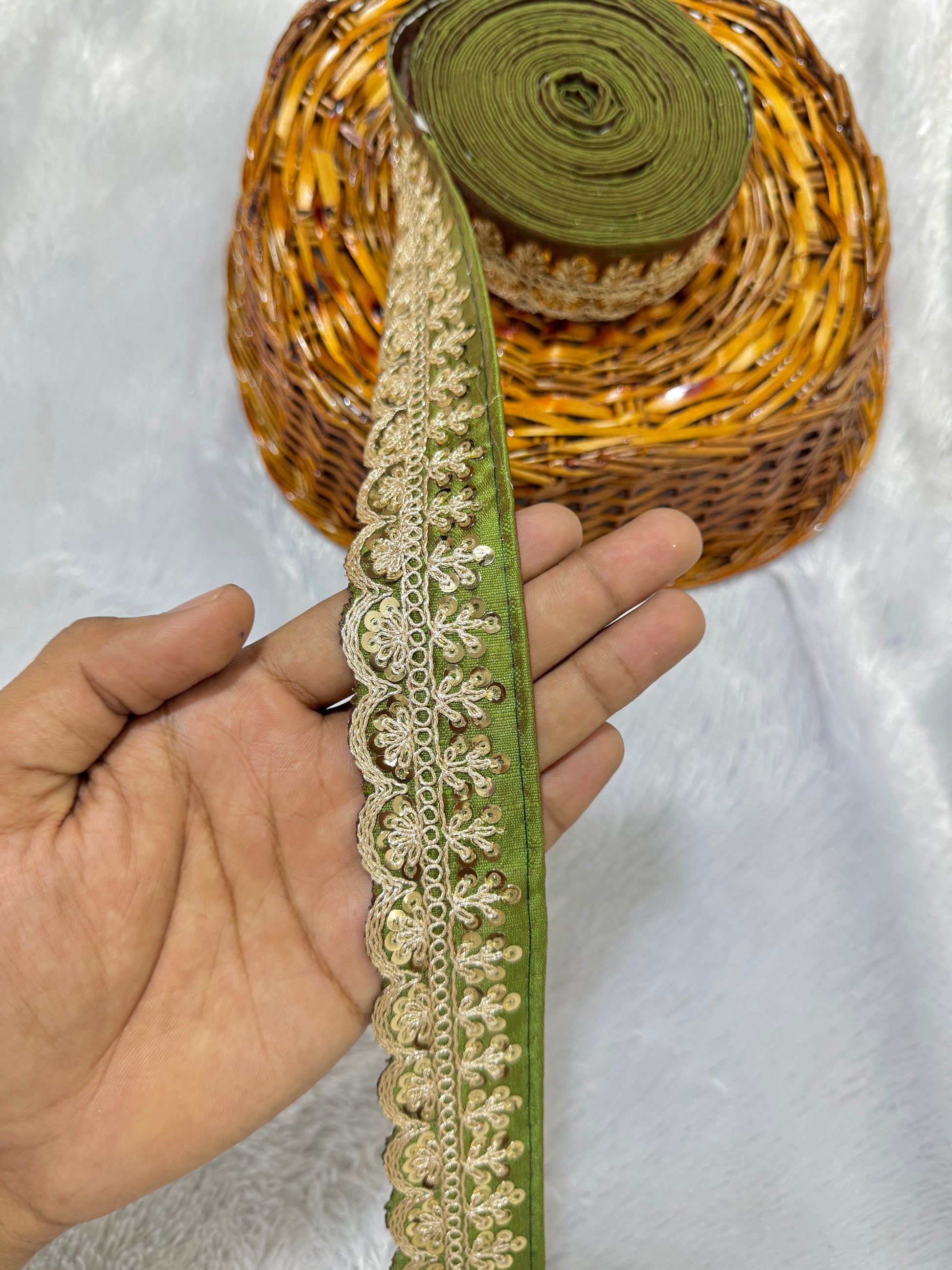 rawsilk fancy lace border with coding work sequence (pack of 9 meter) mehandi green